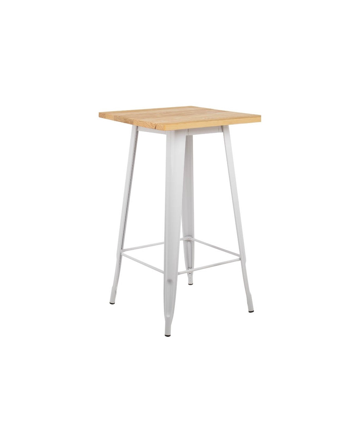 La Mesa Tol Alta Madera combina acero soldado y madera de pino para ofrecer un diseño industrial y funcional. Perfecta para bares y cocinas.
