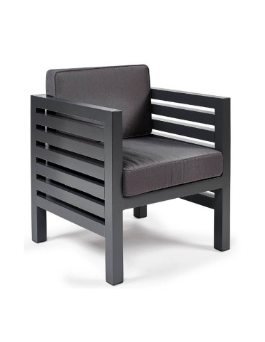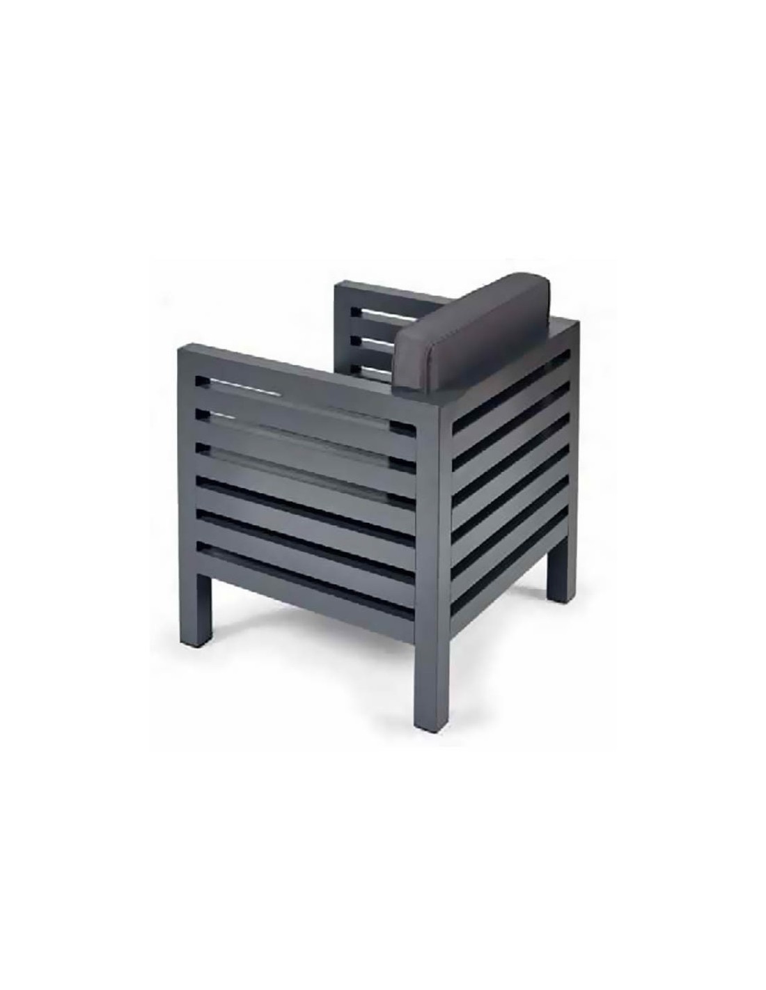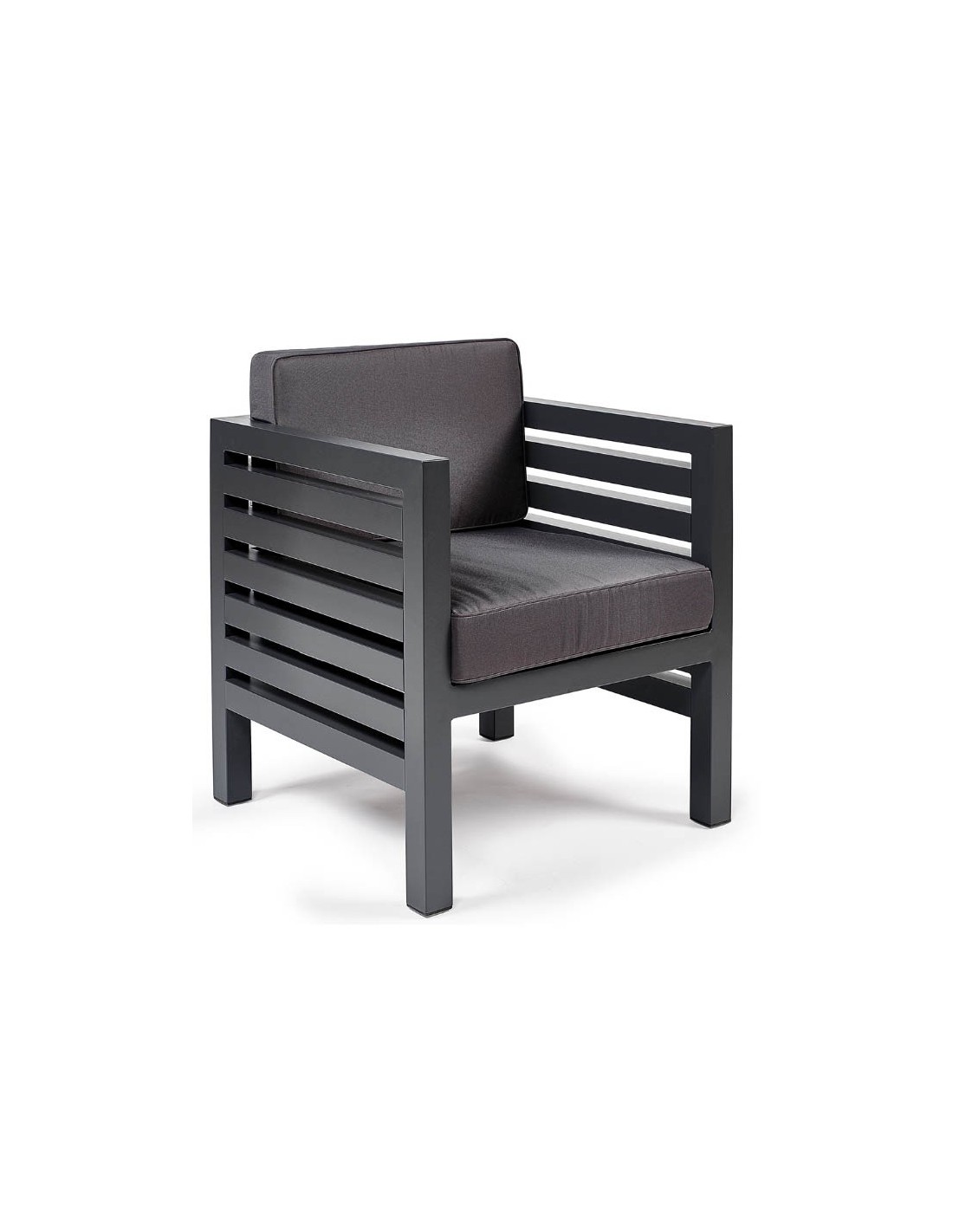 Diseñada tanto para espacios íntimos como para áreas de reunión más amplias, esta butaca está disponible en configuraciones de uno o dos asientos, adaptándose a diversas necesidades y preferencias. Su estructura de aluminio pintado, disponible en grafito, taupe o blanco, no solo ofrece durabilidad y resistencia a los elementos, sino que también aporta un toque de elegancia contemporánea a cualquier entorno al aire libre.