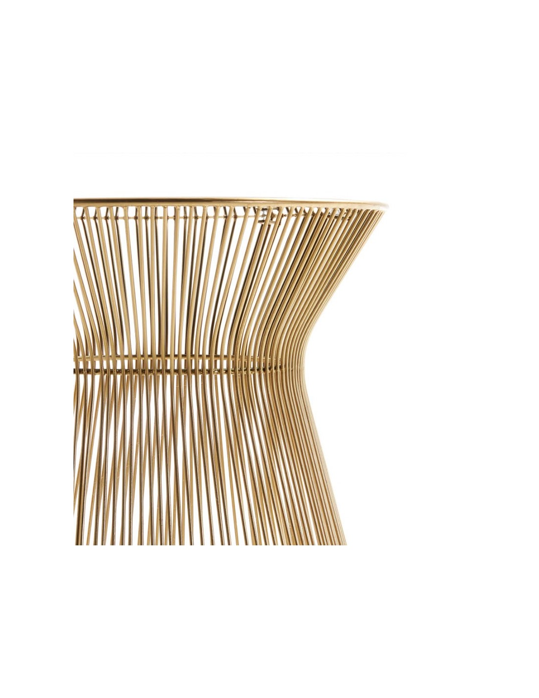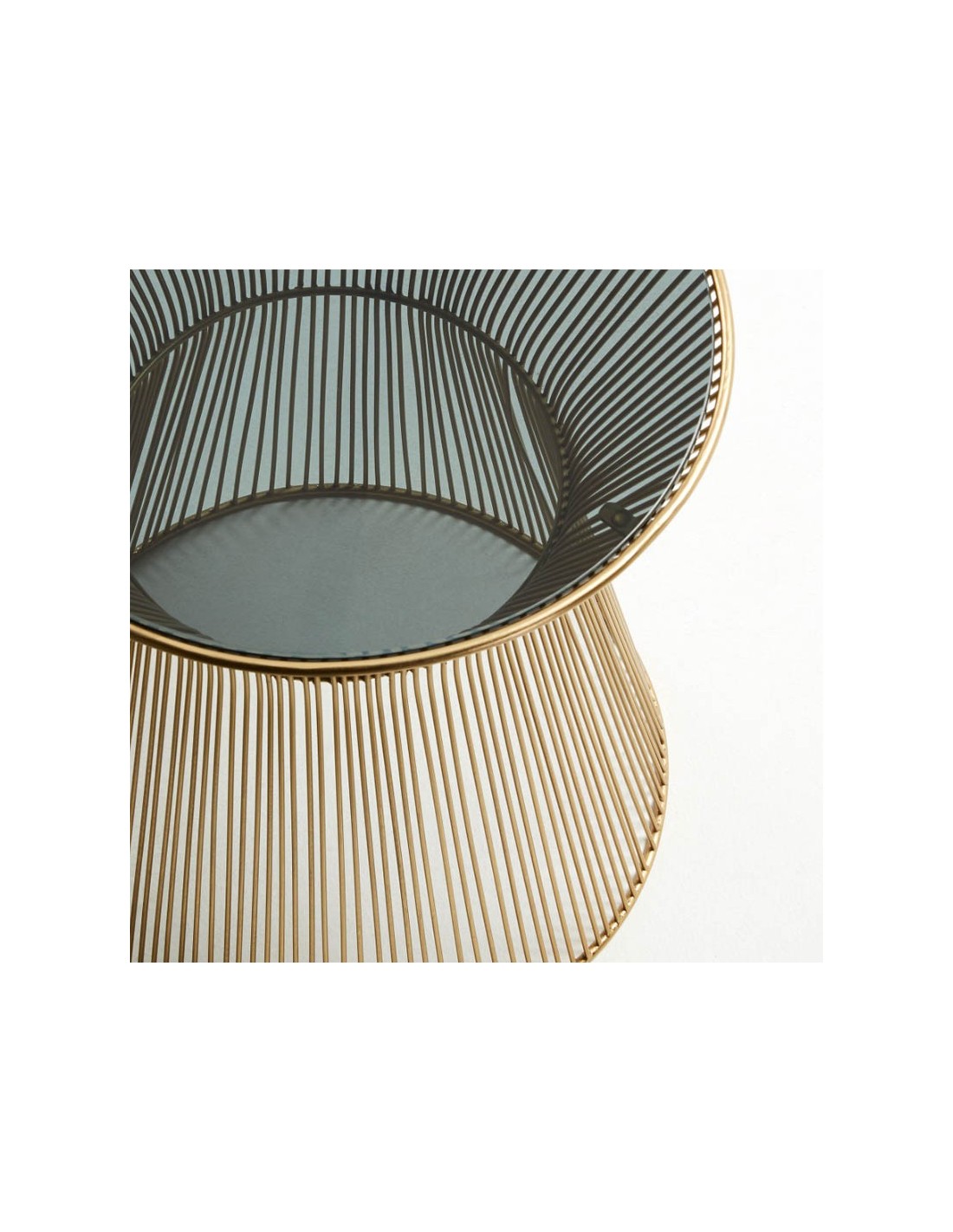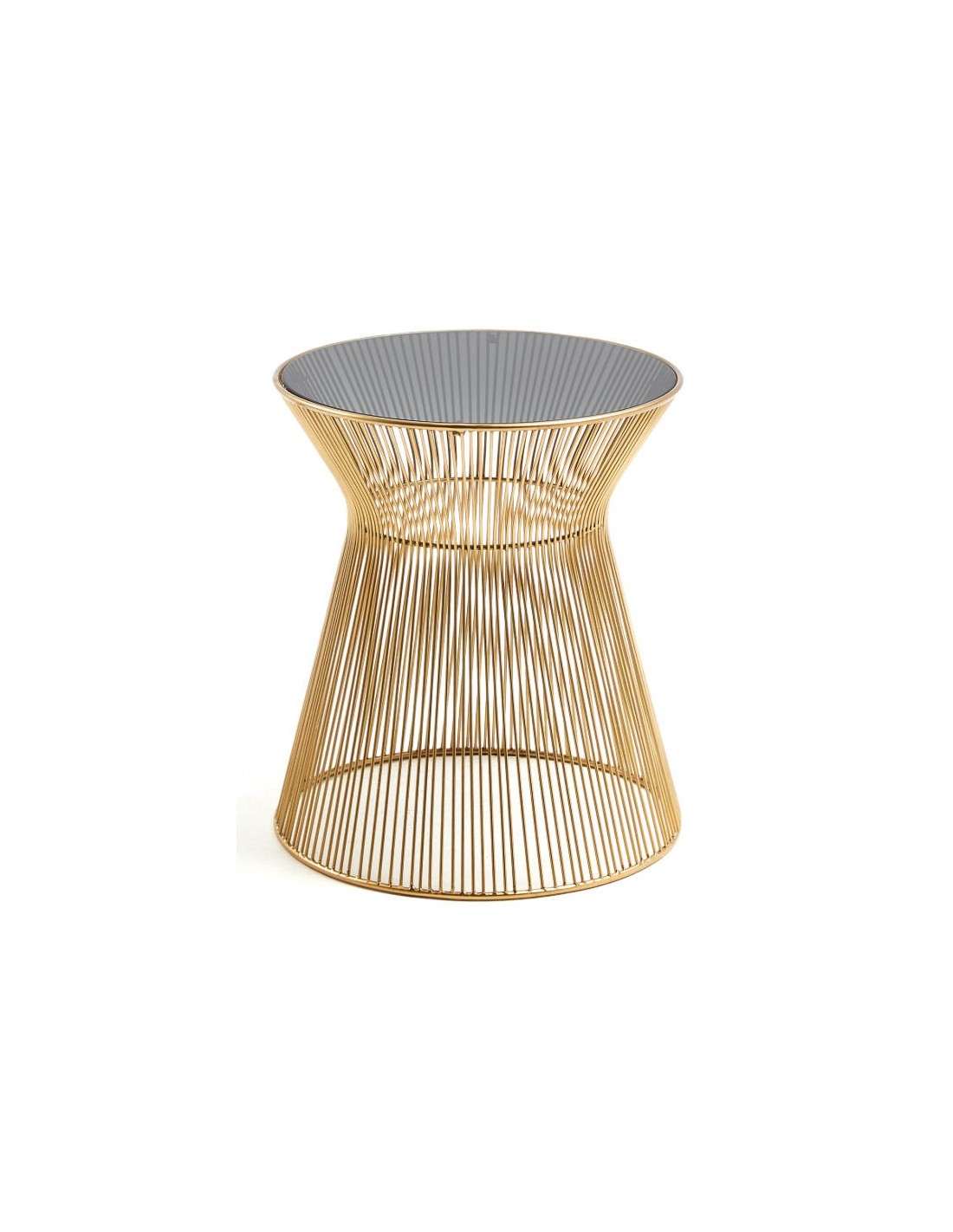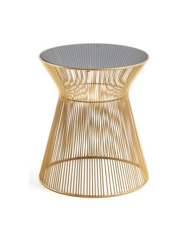 Con un sobre redondo de cristal negro traslúcido y una estructura de varillas de hierro con acabado dorado, esta mesa aporta un toque de sofisticación y modernidad a tu hogar. Su diseño en forma cónica la convierte en la opción perfecta para colocar al lado del sofá, combinando practicidad y estilo.