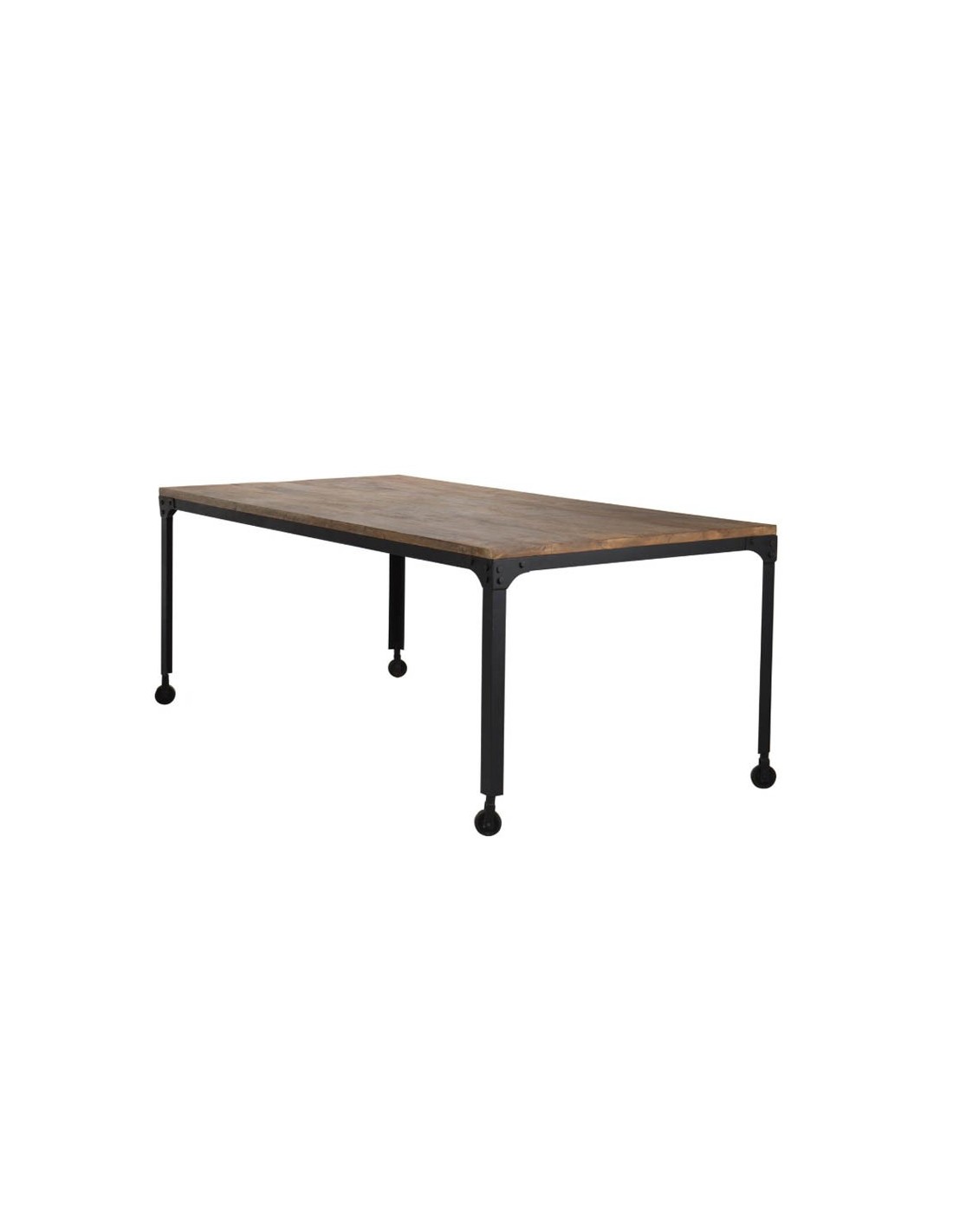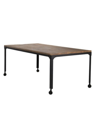 Ideal para salones, comedores y restaurantes, esta mesa combina una estructura robusta de acero con un acabado envejecido y un tablero de madera oscura, aportando un toque de elegancia industrial a cualquier espacio interior.