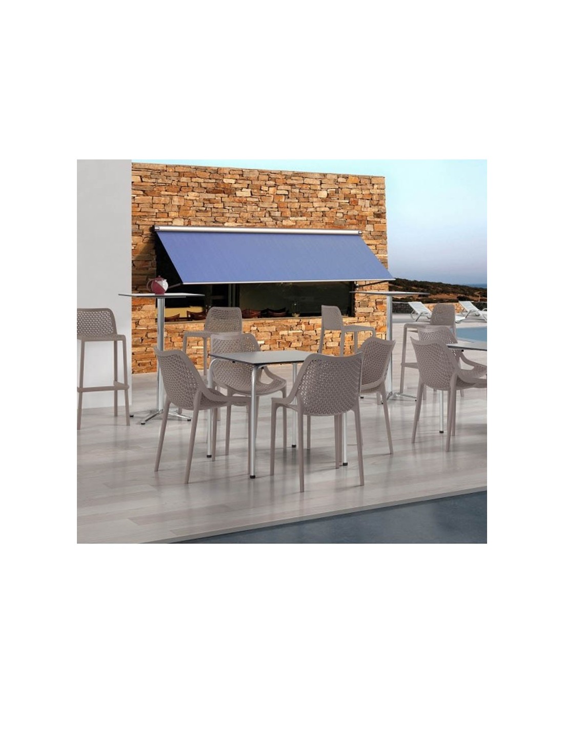 Con tratamiento anti-UV en blanco, antracita o tórtola. Combínala con nuestro taburete y sillón a juego para crear un conjunto armonioso. Cantidad mínima de compra: 4 unidades.