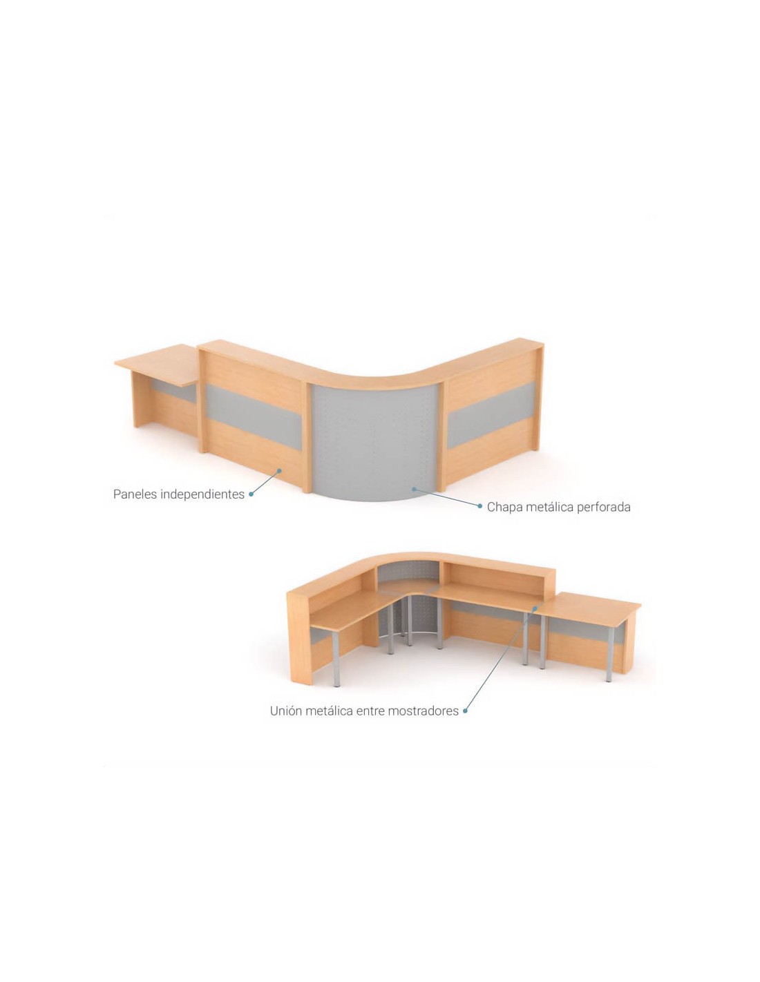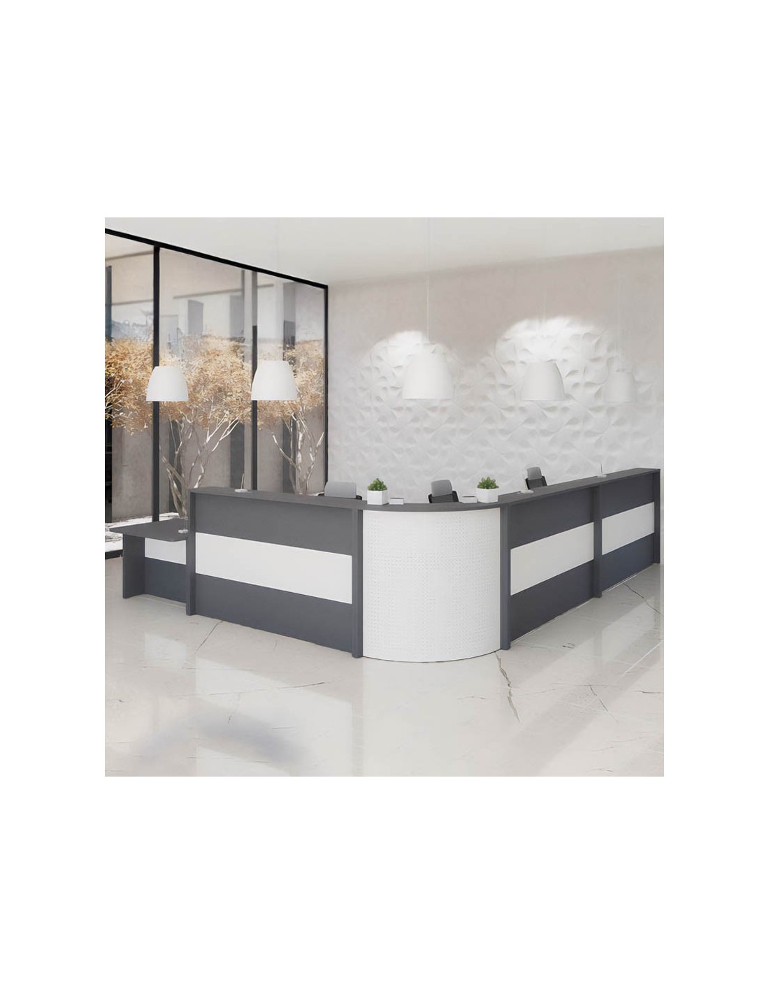 El Mostrador Recepción Georgia Curvo es ideal para empresas que ya poseen el mostrador Georgia y desean añadir un elemento curvo que complemente y mejore la funcionalidad y estética de su espacio de recepción.