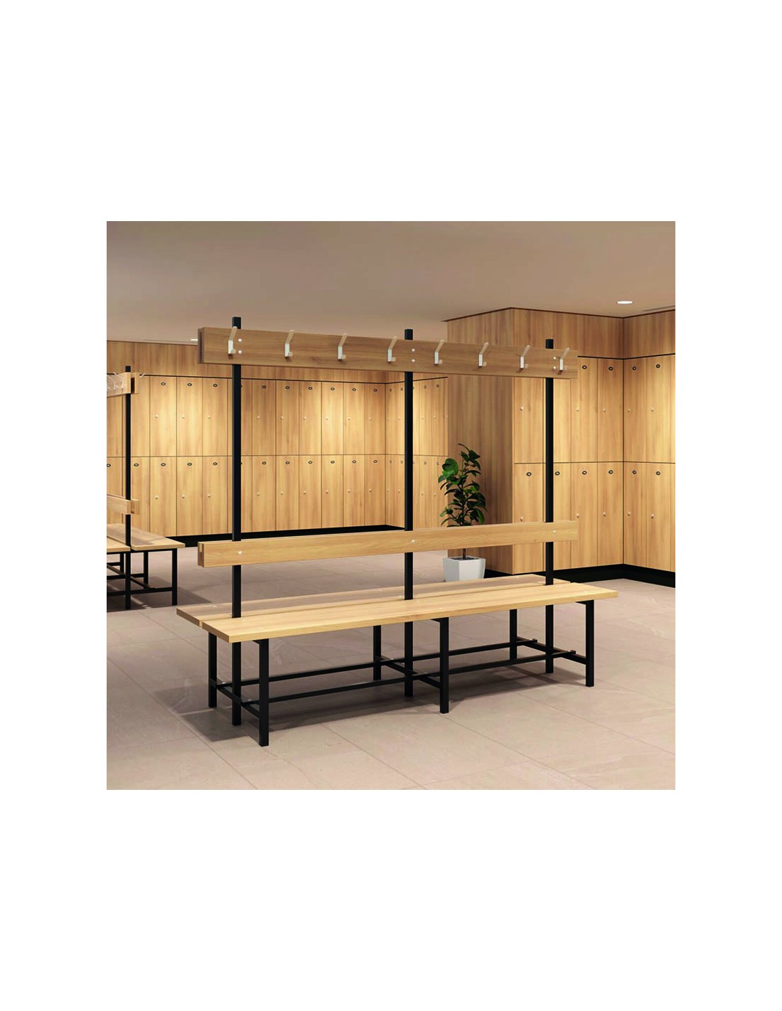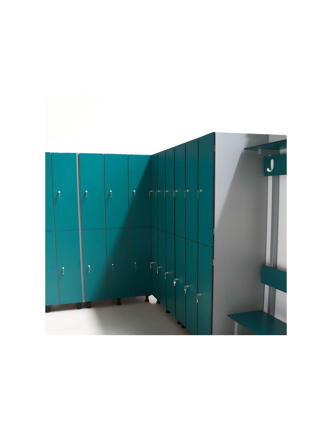 Taquilla fabricada con tableros de melamina hidrófuga de 16 mm. canteada en PVC y puertas de melamina de 19 mm. canteadas en PVC. Trasera ventilada de 3 mm. de espesor.