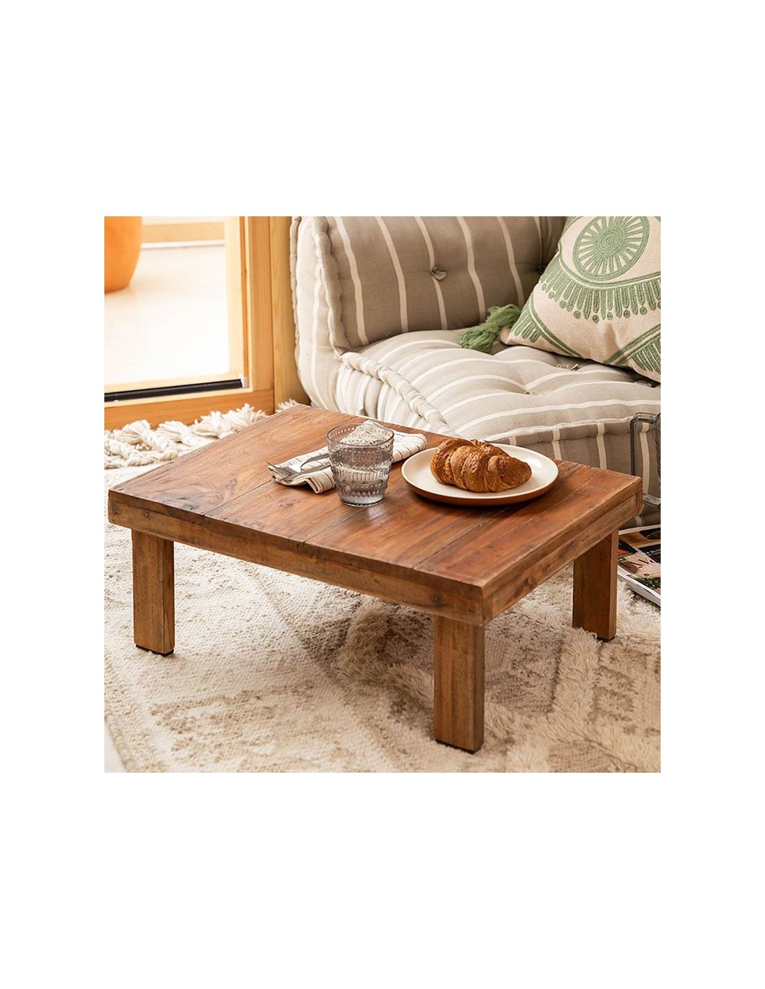 Fabricada en madera reciclada, esta mesa es una obra artesanal que aporta un toque distintivo y ecológico a cualquier espacio. Su acabado natural puede presentar pequeñas variaciones y peculiaridades, lo que la convierte en una pieza única y llena de carácter.