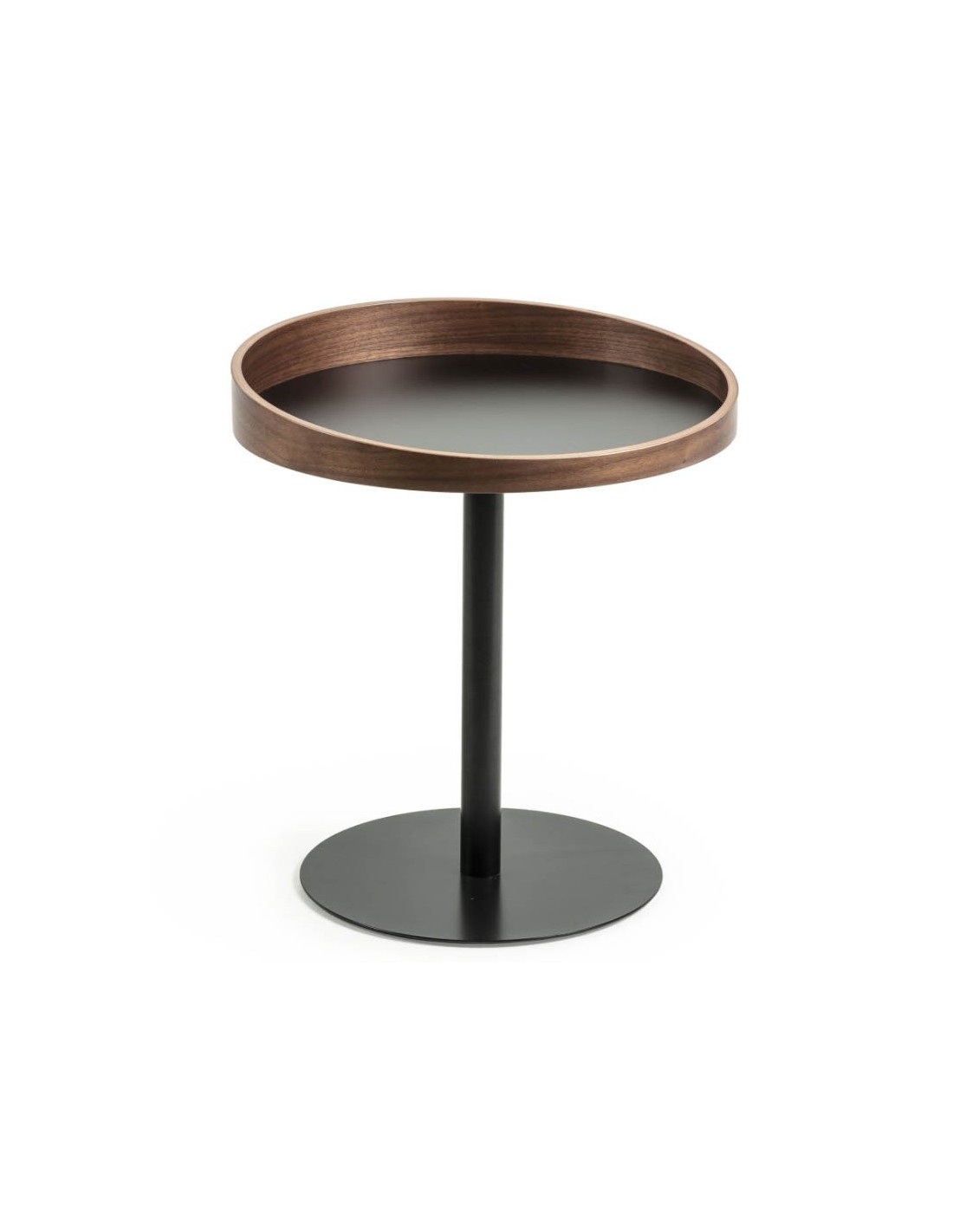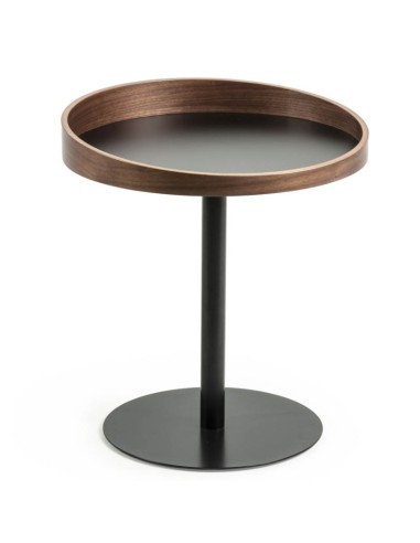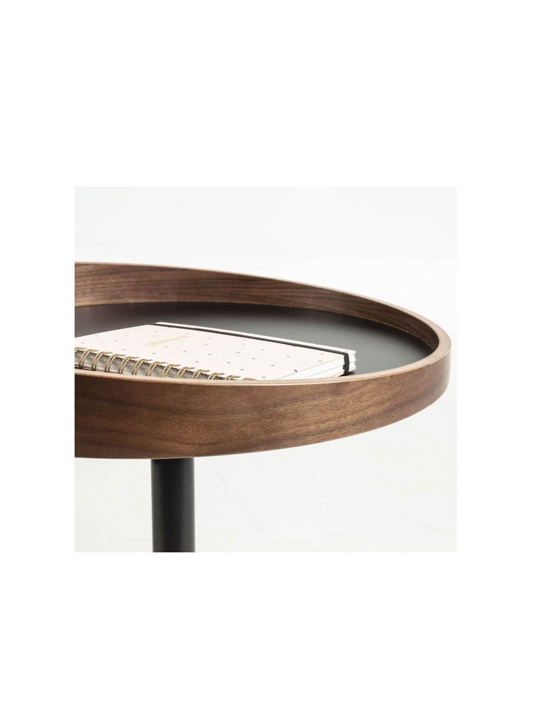 Con un sobre en chapado de nogal y un pie de metal, esta mesa combina materiales de alta calidad con un diseño moderno. Ideal para aquellos que buscan una pieza versátil y estilizada para complementar su decoración.