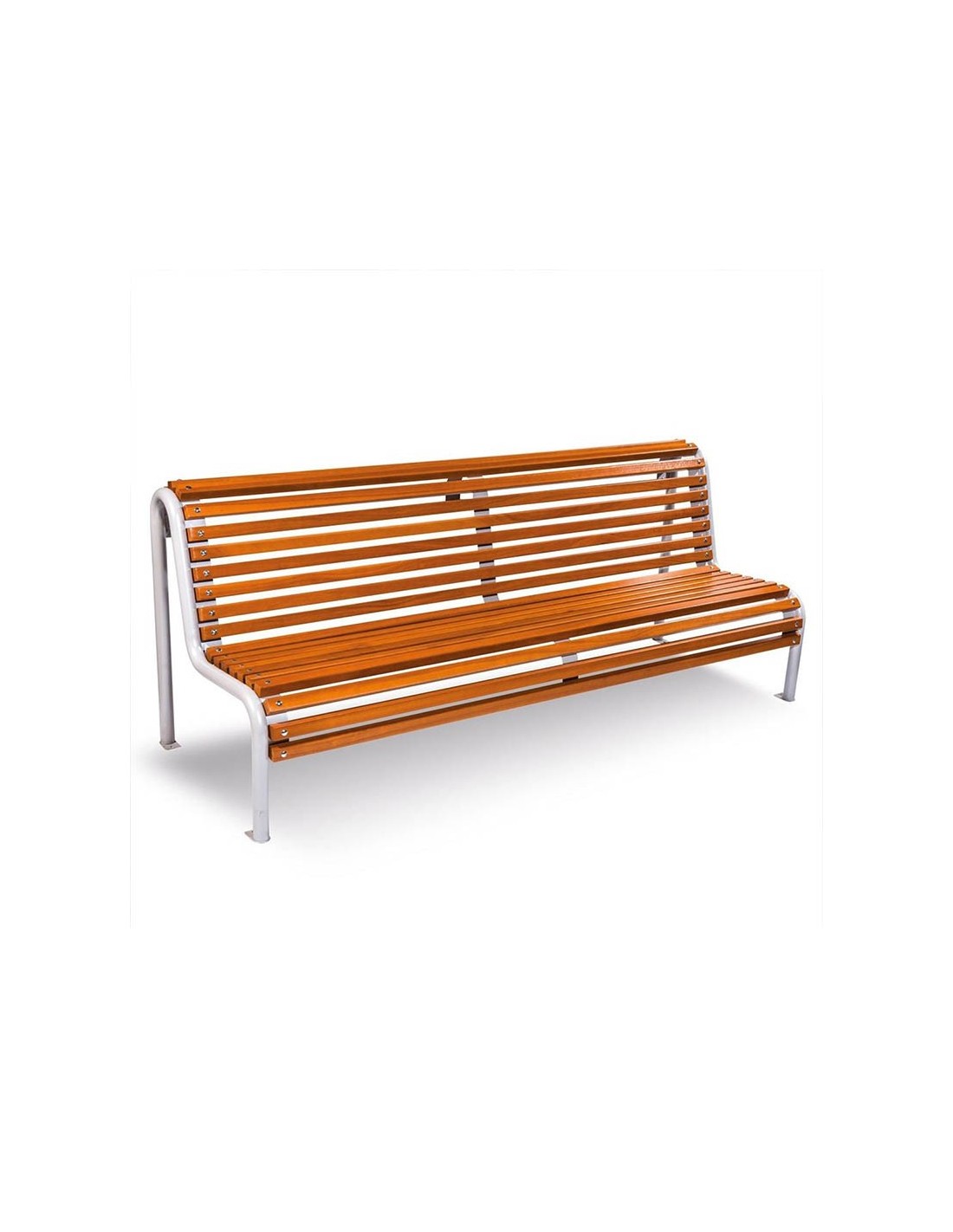 Su estructura metálica de tubo circular, pintada en RAL 9006, garantiza resistencia y protección contra las inclemencias del tiempo, mientras que sus 23 listones de madera de guinea de 2000 mm de largo aportan calidez y belleza al diseño. Los pies de acero galvanizado y la madera tratada con barniz fungicida e hidrofugo aseguran una larga vida útil. Con dimensiones de 726x2045x909 mm, este banco ofrece comodidad y espacio suficiente. Tornillos M10x100 para el anclaje no están incluidos.