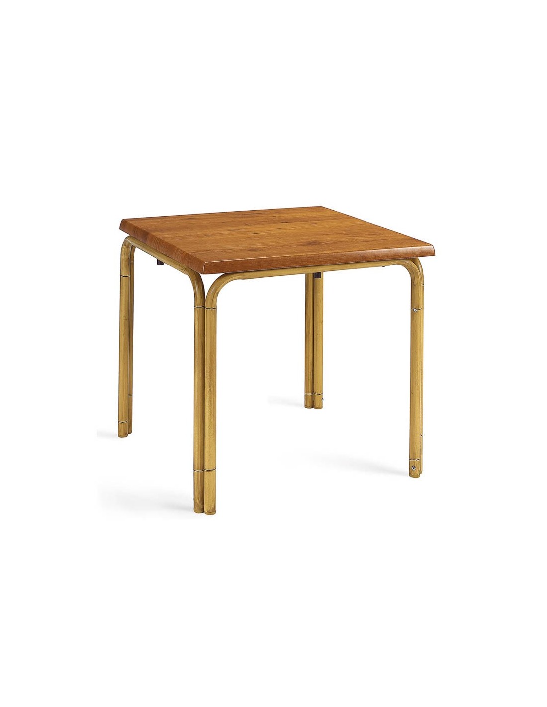 La Mesa Doble Tubo Werzalit (bambú), con estructura de aluminio y tablero de Werzalit, es versátil y apilable. Ideal para comedores, oficinas y más. Medidas 70x70 cm y 80x80 cm.