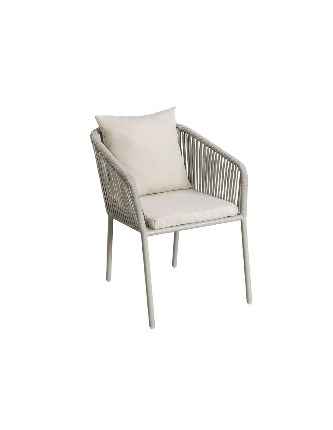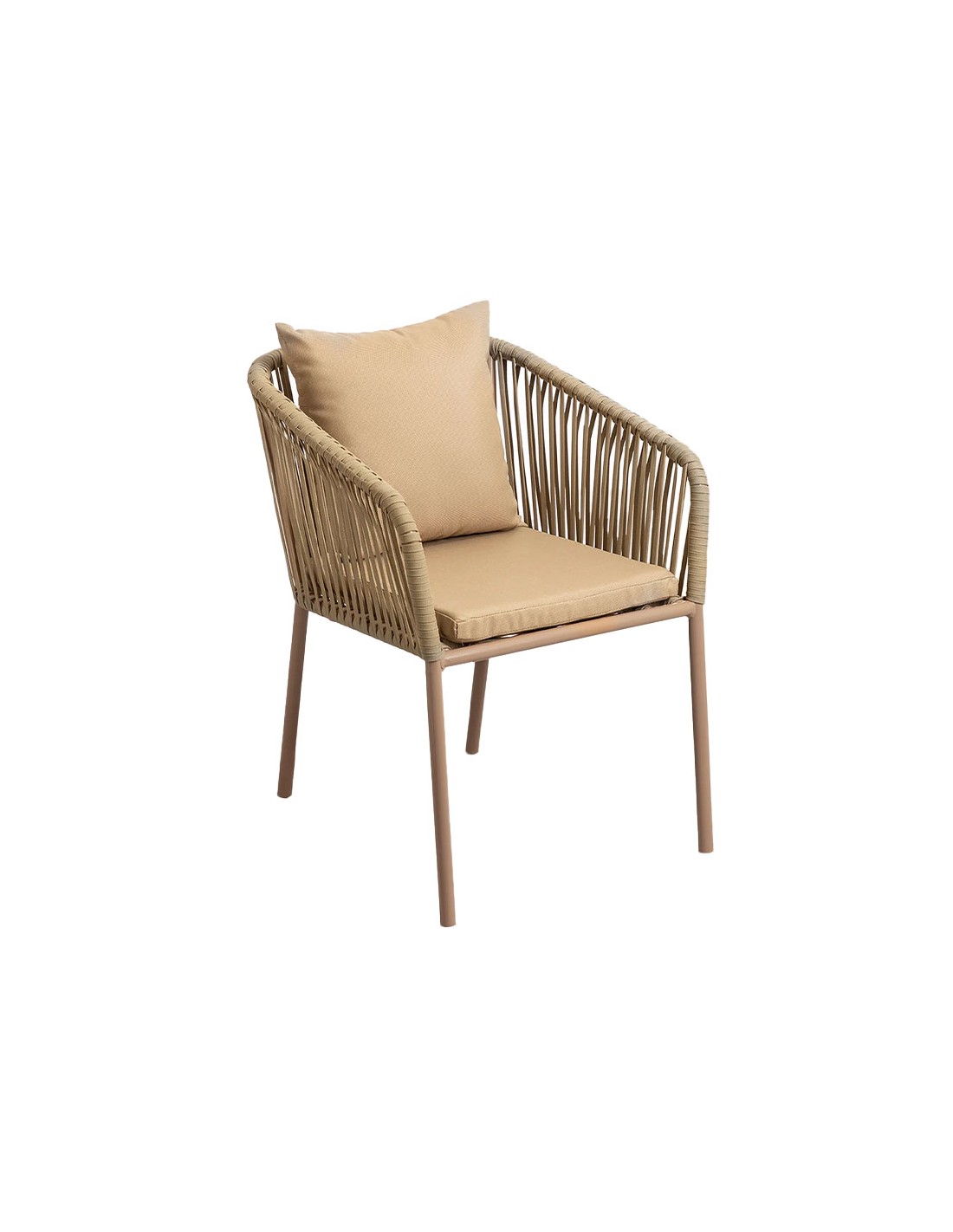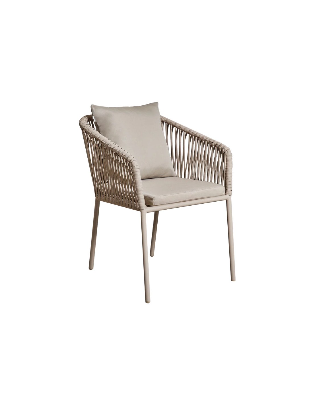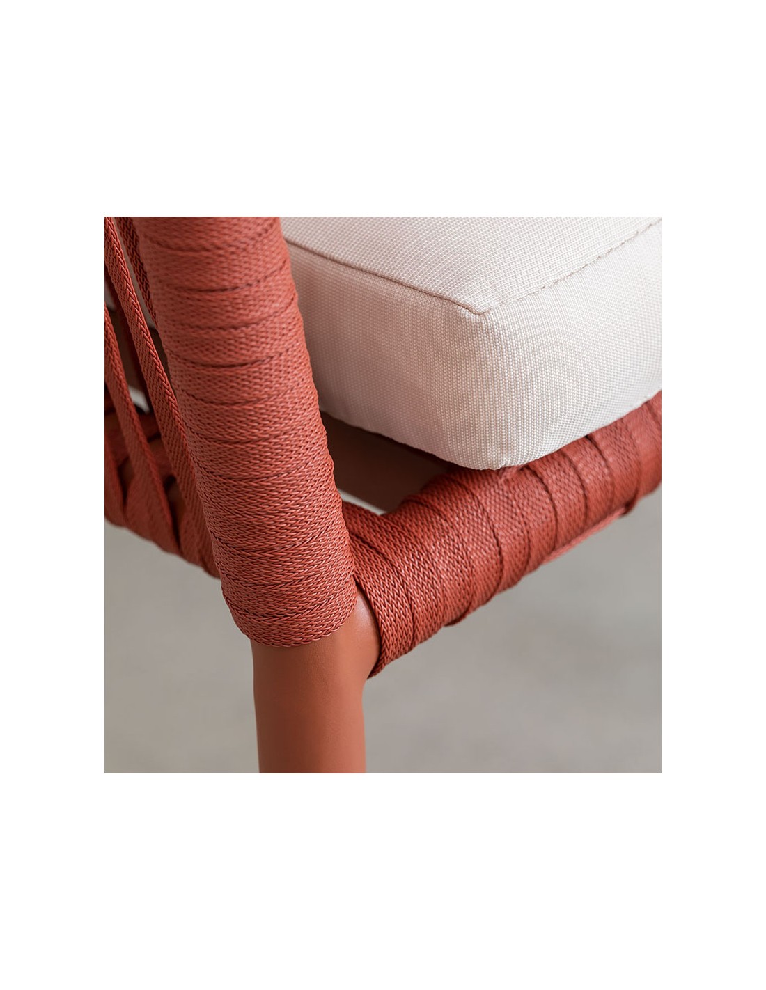 Sillón con estructura de aluminio y acabado en cuerda trenzada, combina robustez y estilo, ideal para relajarse en el jardín.