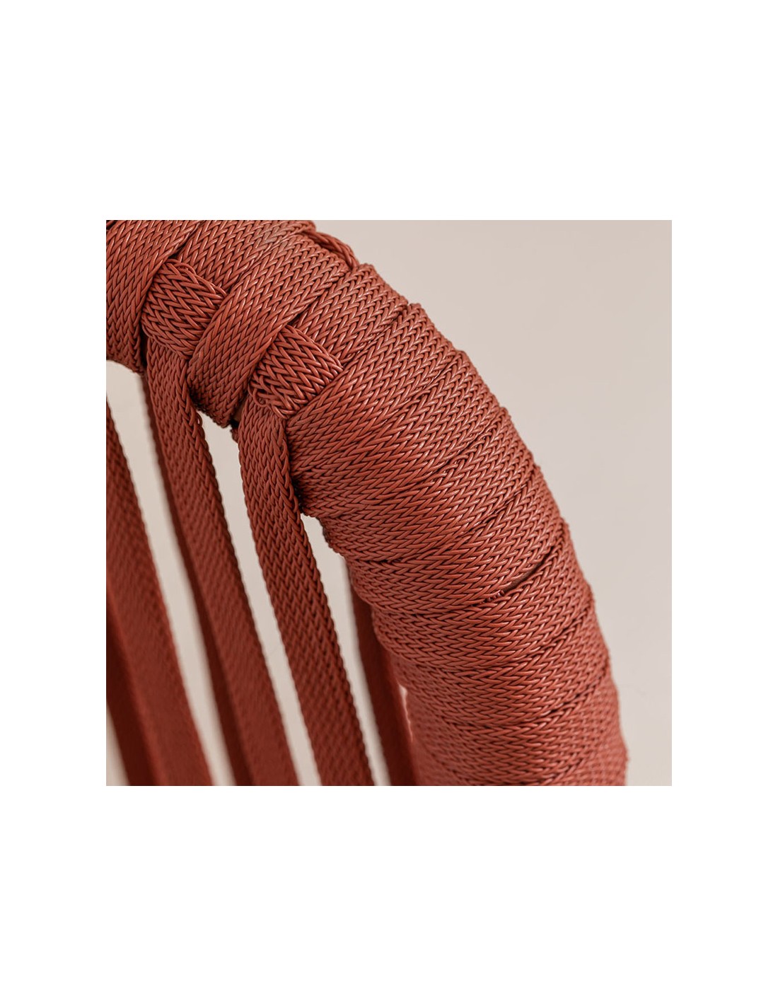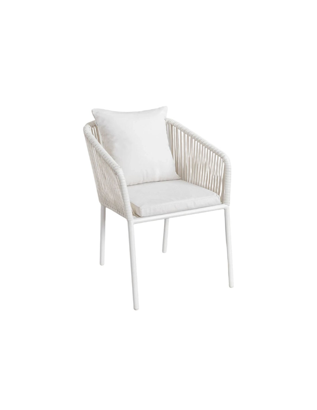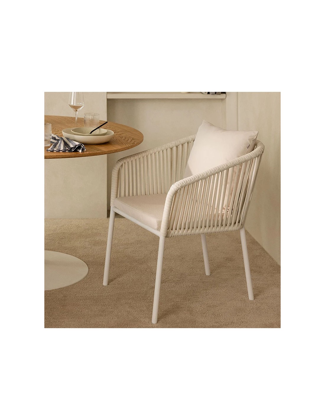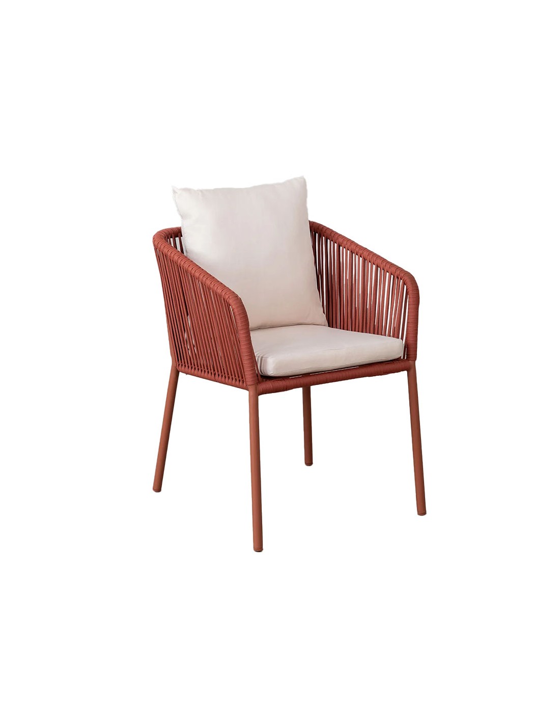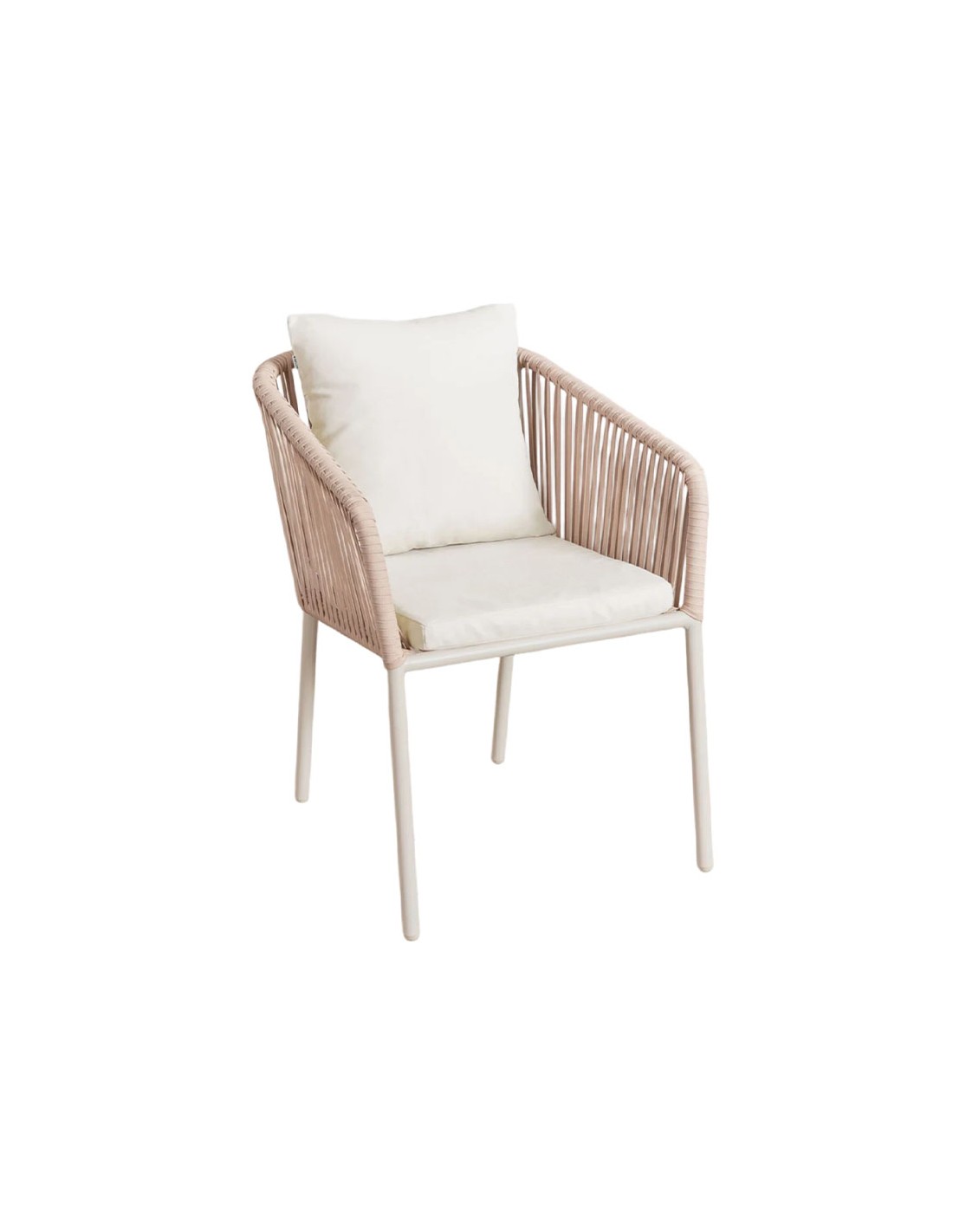 Sillón con estructura de aluminio y acabado en cuerda trenzada, combina robustez y estilo, ideal para relajarse en el jardín.