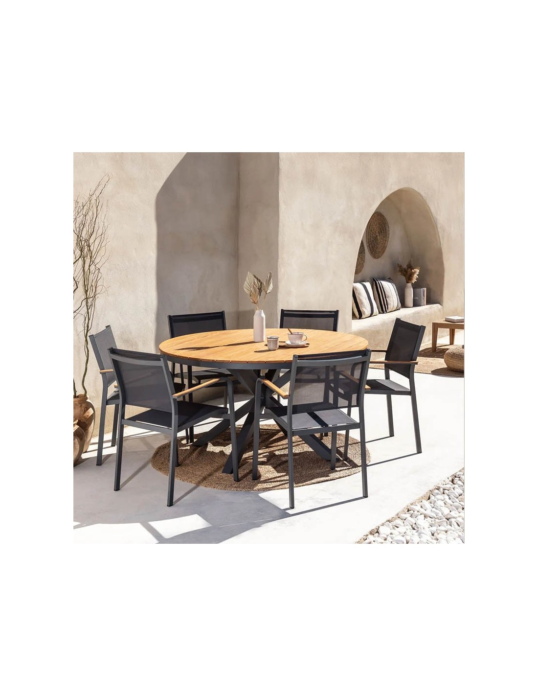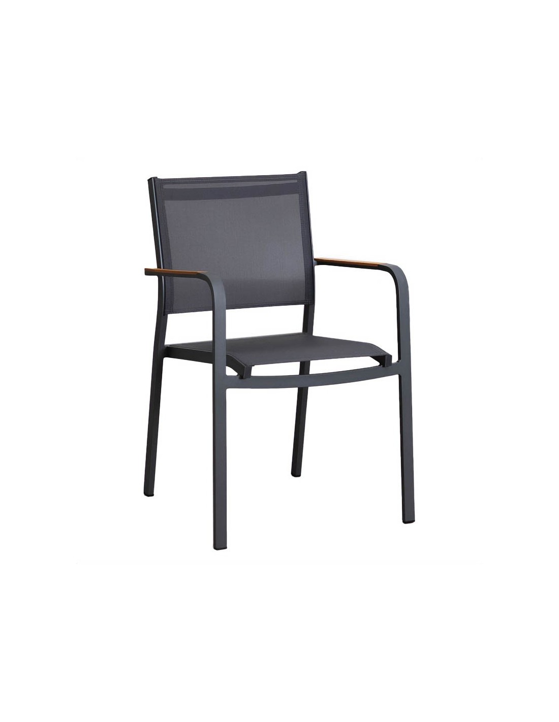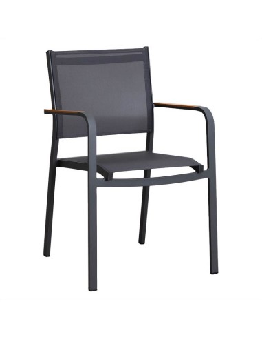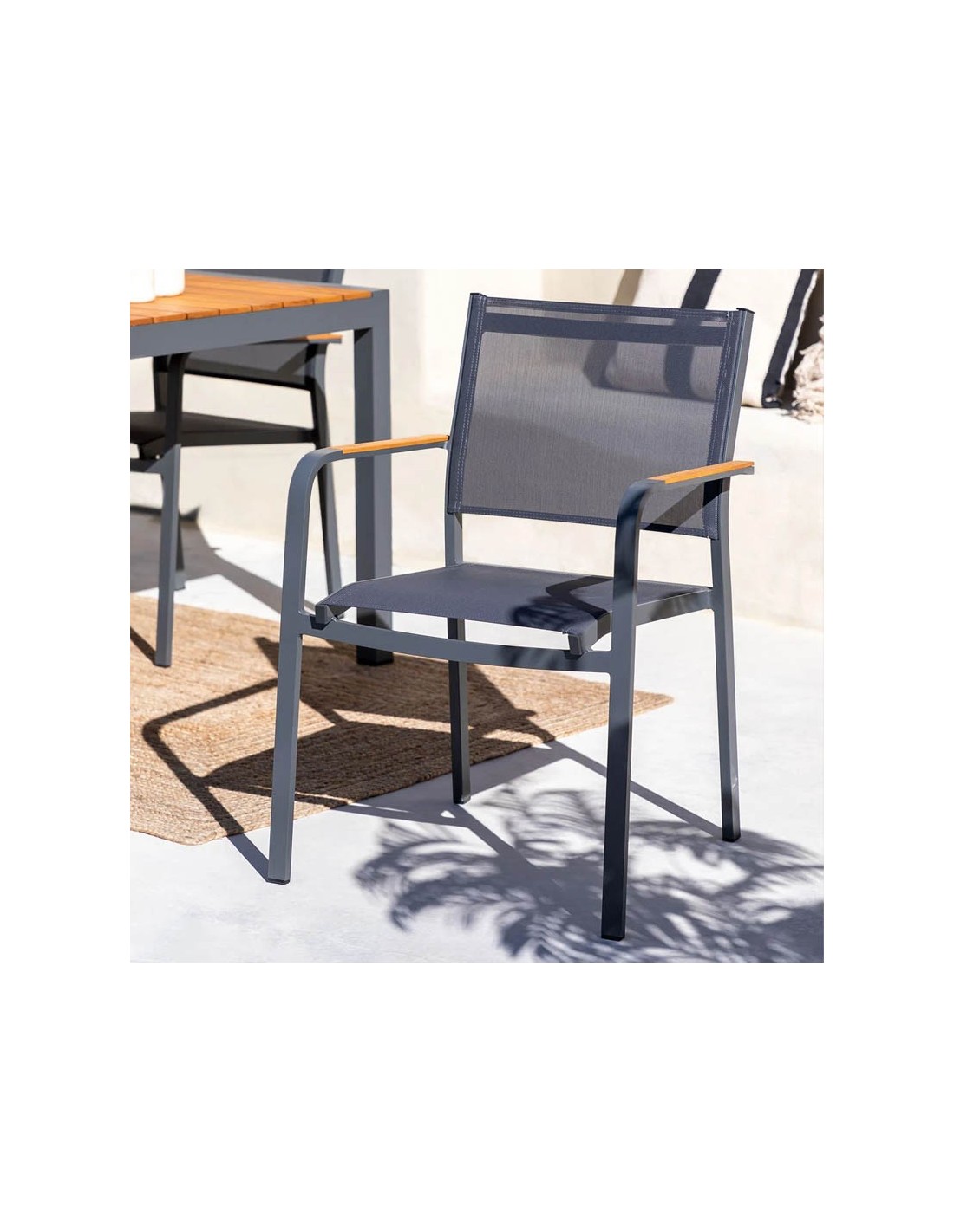 Este sillón, apilable y fabricado en aluminio, textilene y reposabrazos de madera de eucalipto, es la elección perfecta para tu terraza, jardín o espacio de chill out, proporcionando un oasis de relajación al aire libre.