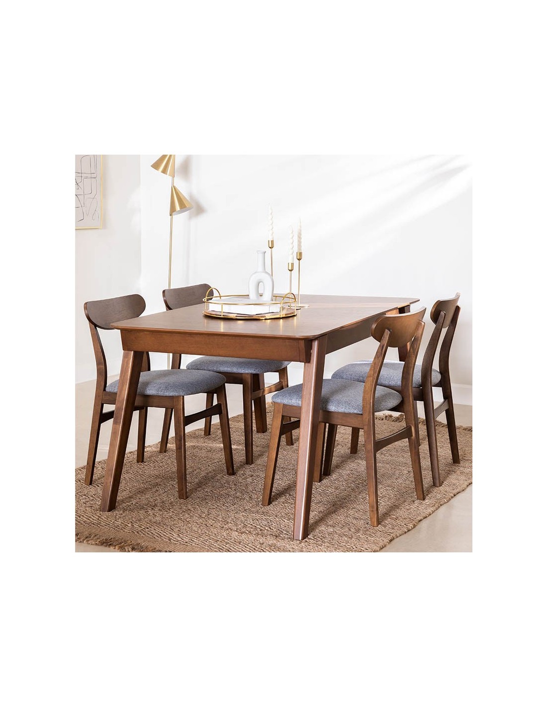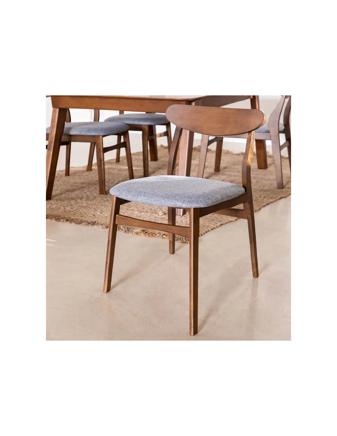 Con una estructura en madera de caucho, asiento tapizado en tela y respaldo sutil, brinda un equilibrio entre estilo y confort.