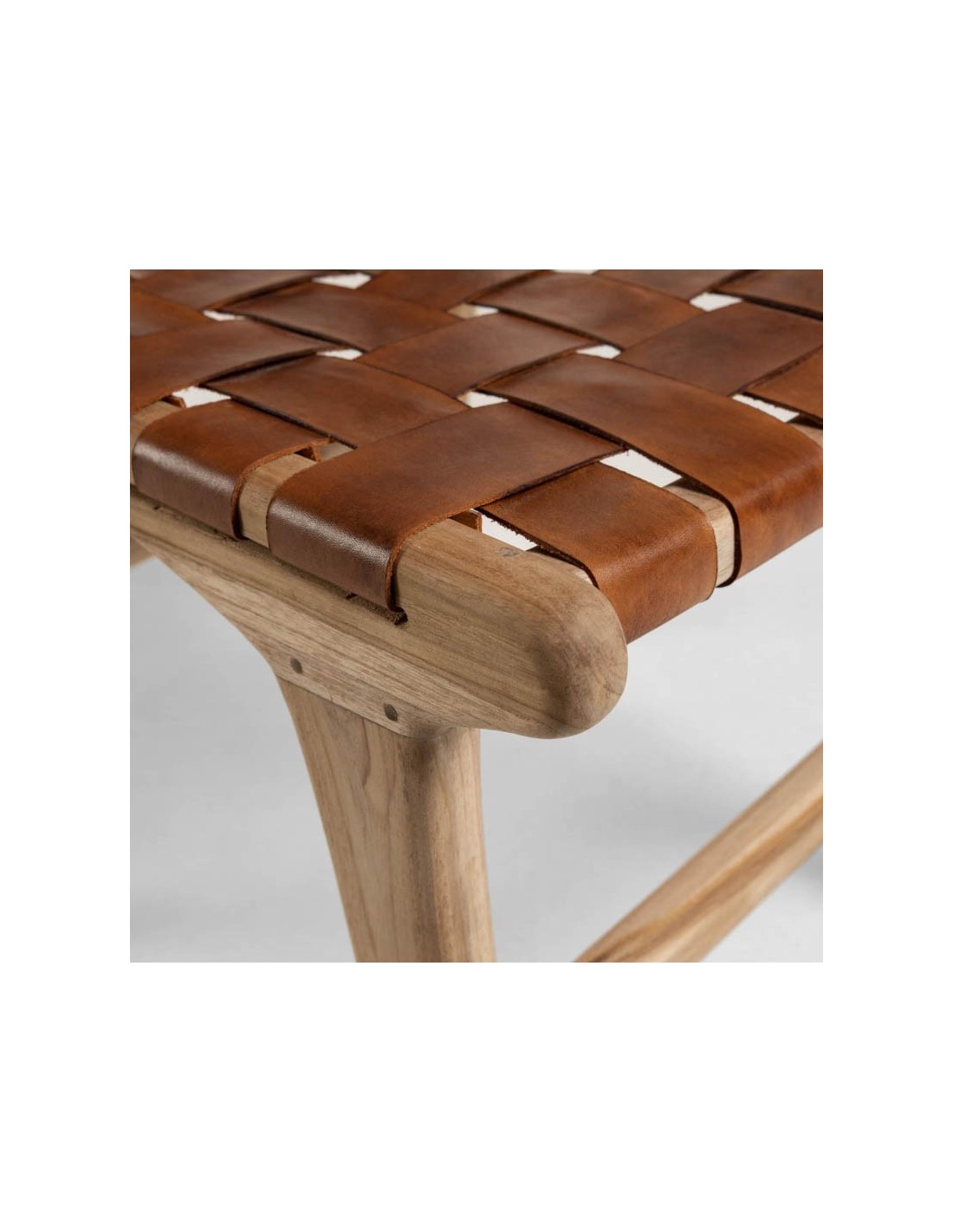 El Taburete Baudilio, con su diseño en madera de teca y detalles en cuero trenzado, combina la belleza de los materiales naturales con la funcionalidad, ideal para añadir un toque acogedor a cualquier interior.