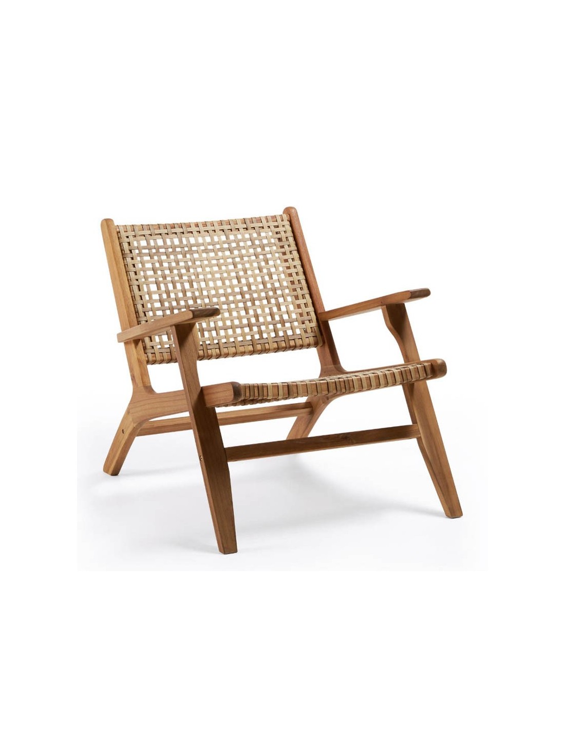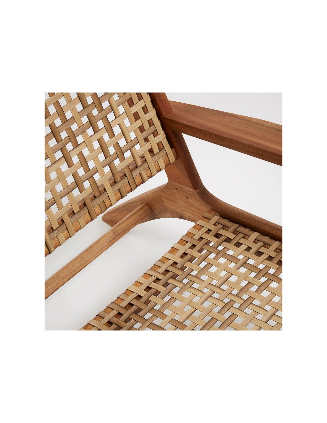 Este sillón actualiza el clásico diseño trenzado a mano, adoptando el mimbre plano sintético por su durabilidad y fácil mantenimiento, sin sacrificar la estética. La estructura de madera maciza de acacia, certificada FSC 100%, asegura no solo una base sólida y duradera sino también una elección consciente por la sostenibilidad.
