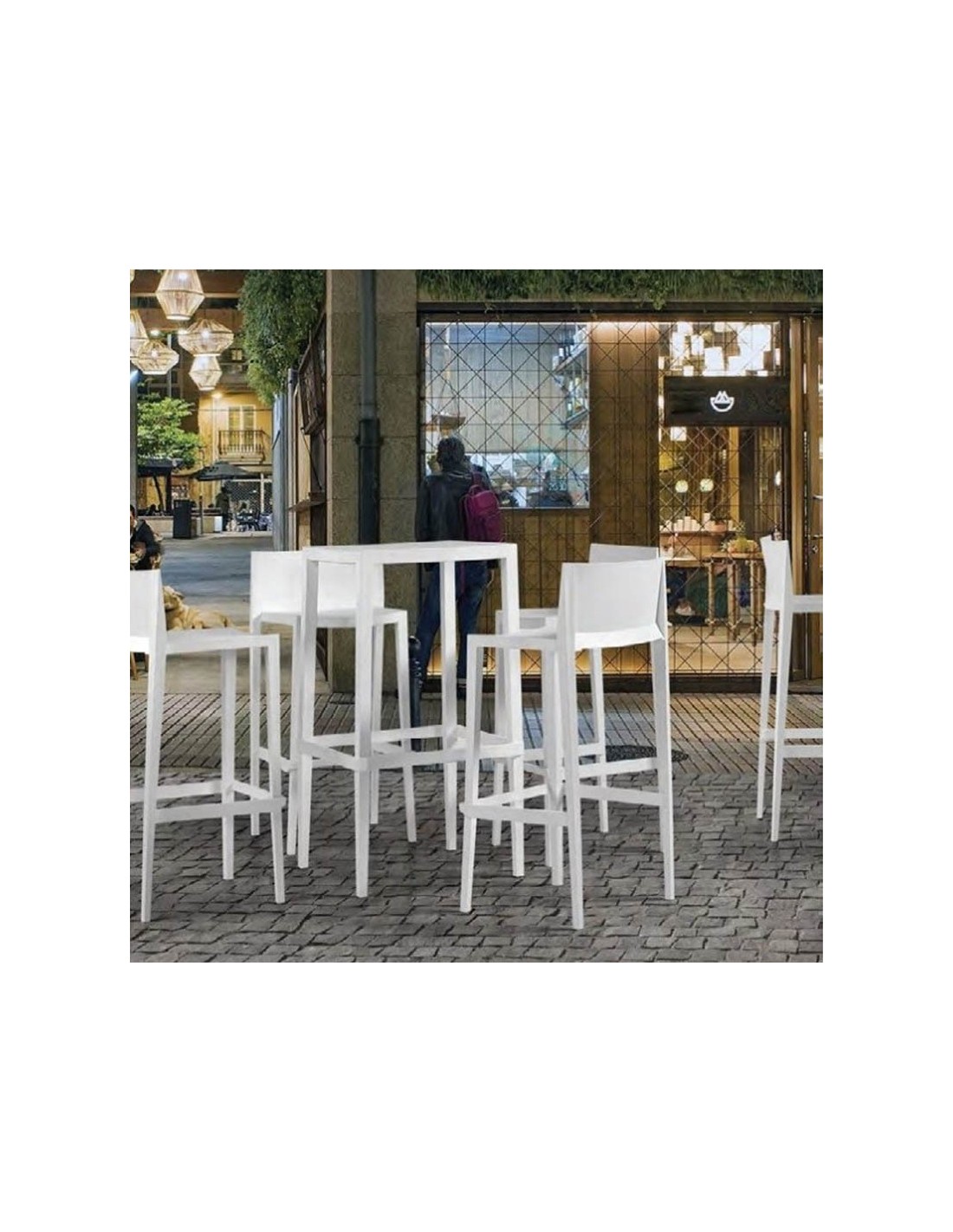 El Taburete Bibiano, destacando por su durabilidad y diseño en polipropileno blanco o negro reforzado, es perfecto tanto para interiores como exteriores, gracias a su tratamiento anti UV y variedad de colores.