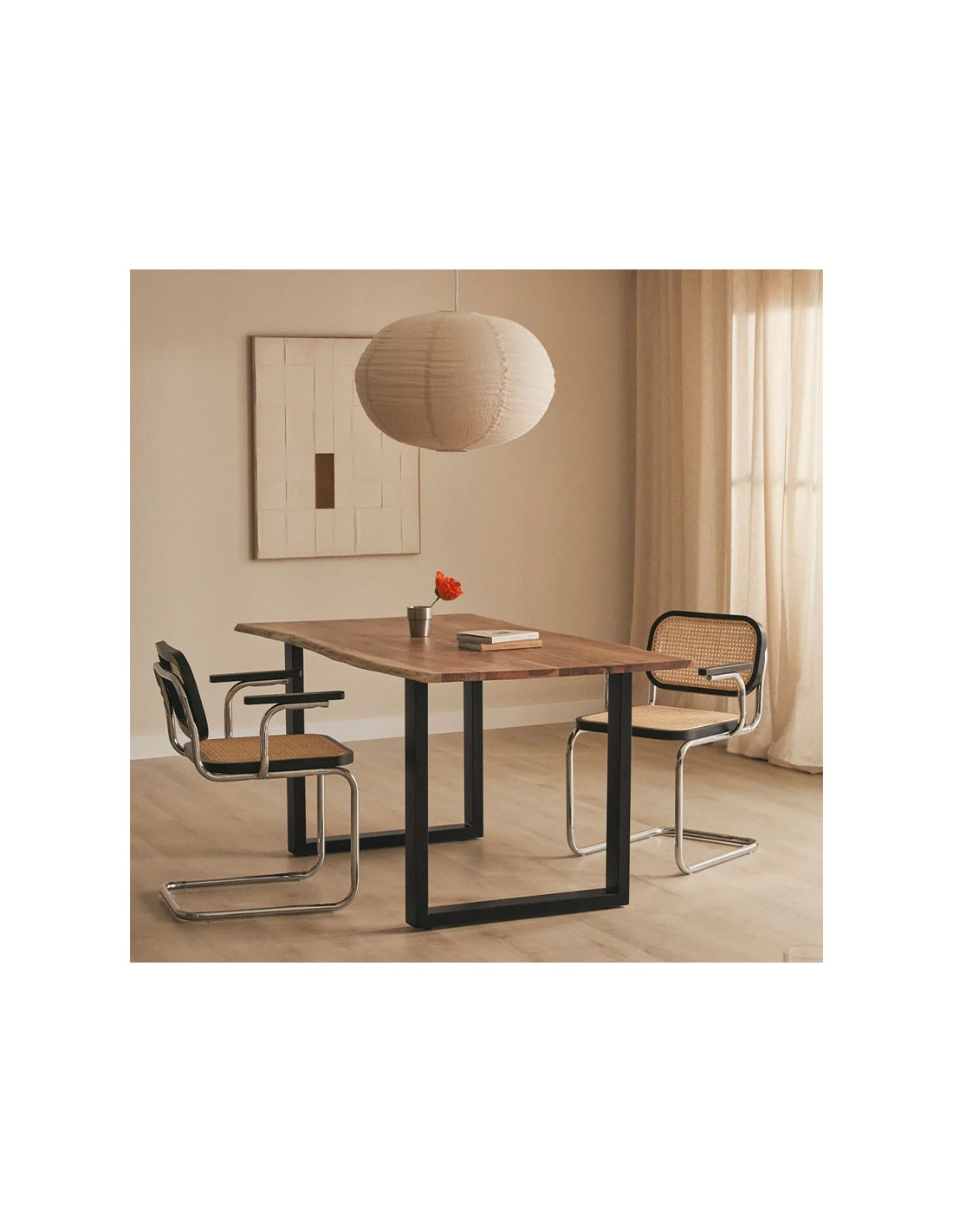 • Estilo Industrial: La combinación de madera y hierro le confiere a la Mesa Calixto un estilo industrial moderno que se adapta a diferentes tipos de decoración.