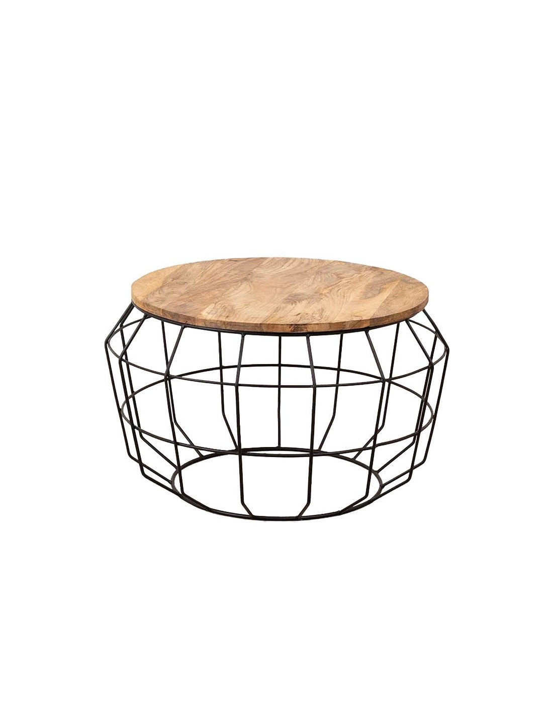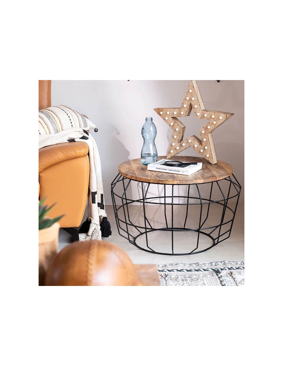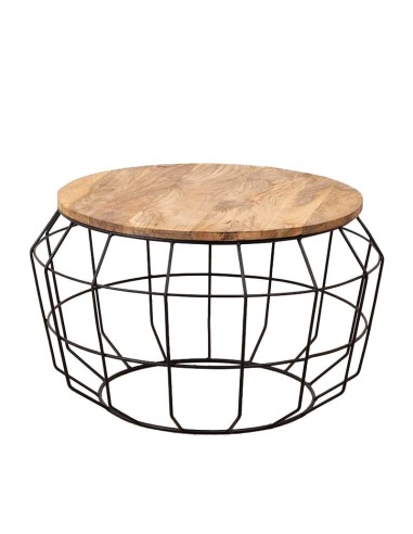 Su tablero circular de madera reciclada descansa sobre una base de finas varillas de alambre de acero, aportando un contraste perfecto entre el estilo industrial y la calidez de la madera. Esta mesa no solo es funcional, sino que también es un elemento decorativo ideal para cualquier salón moderno.
