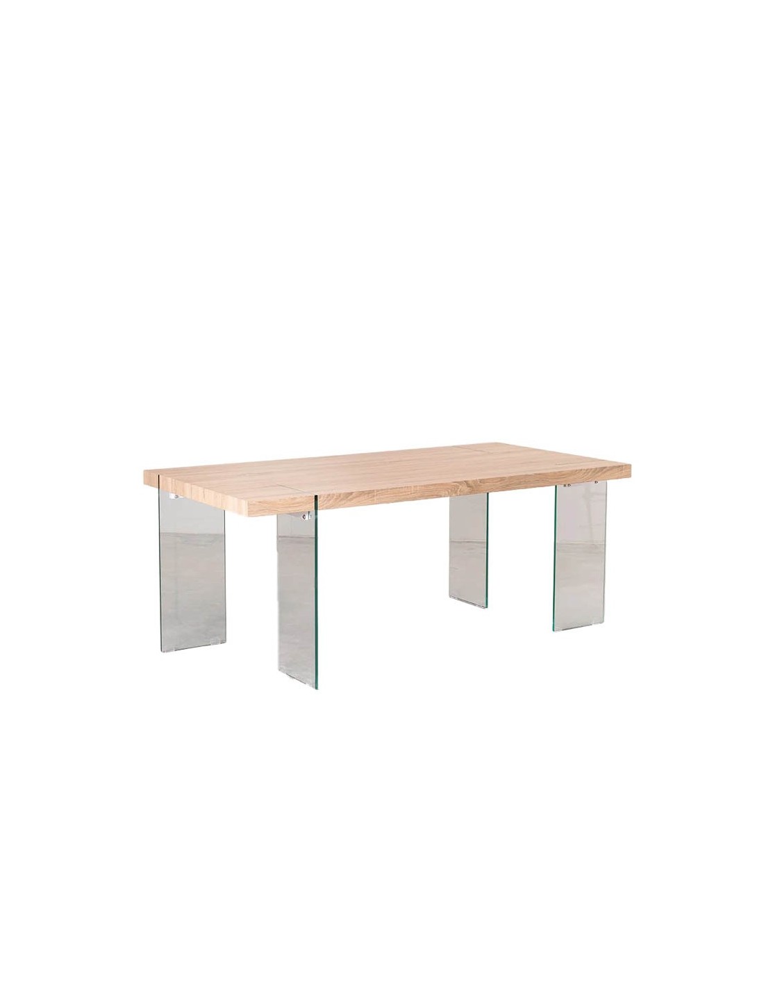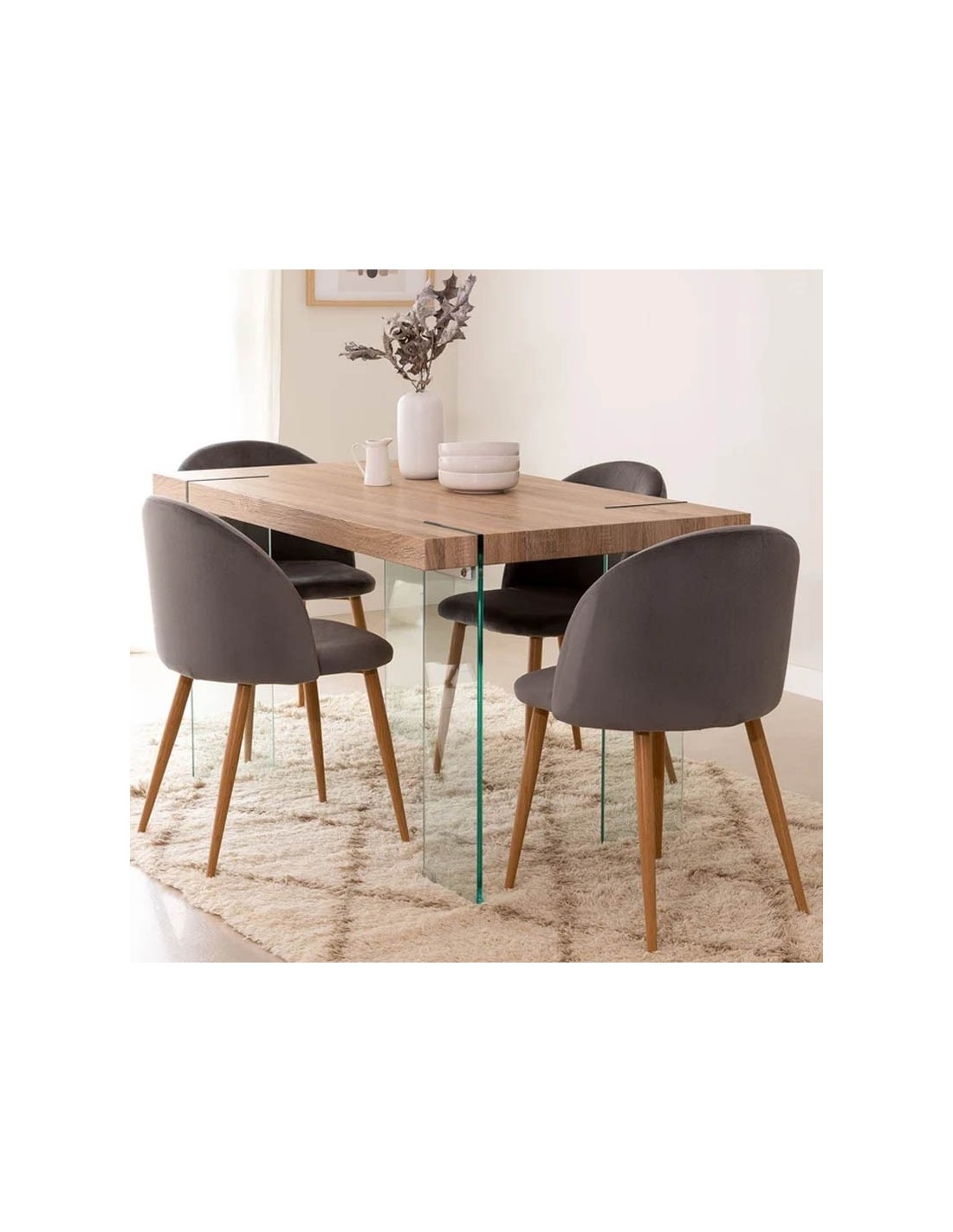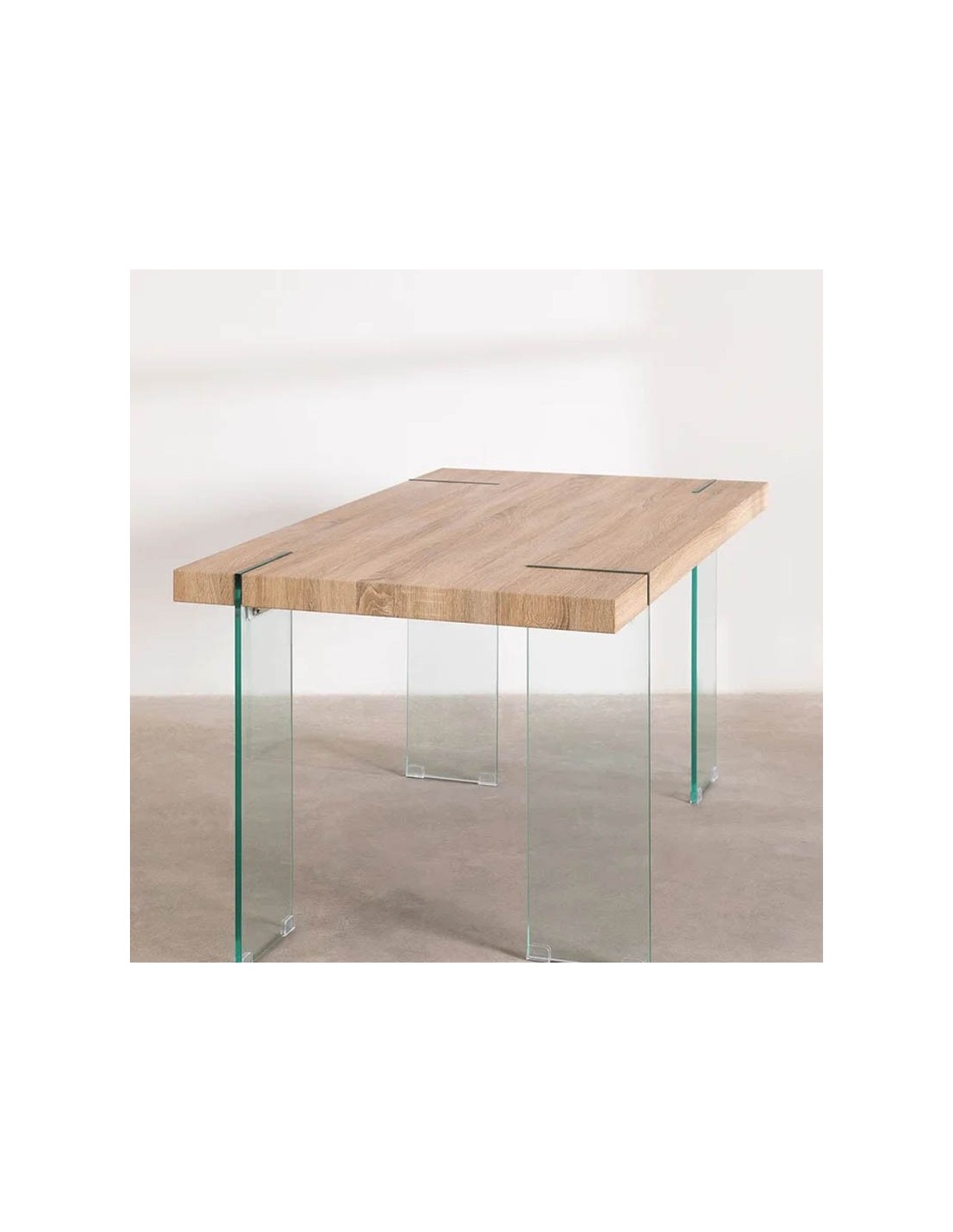Su estructura en MDF con patas de cristal proporciona un equilibrio perfecto entre la calidez de la madera y la sobriedad del vidrio, haciendo de esta mesa una pieza central en cualquier comedor.