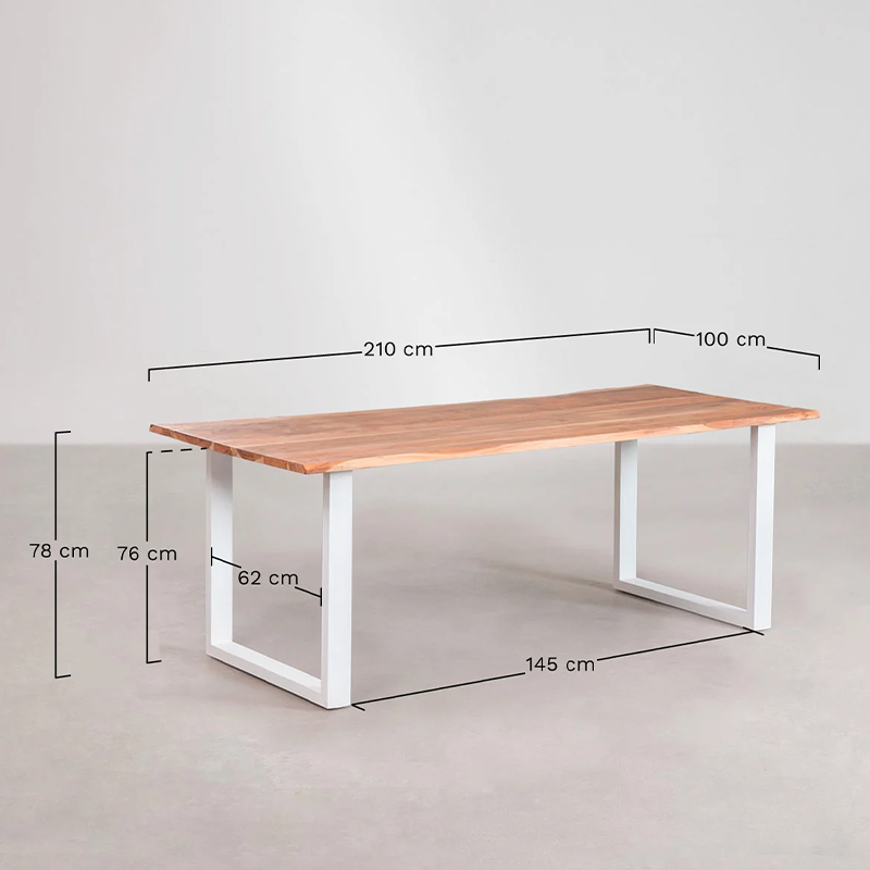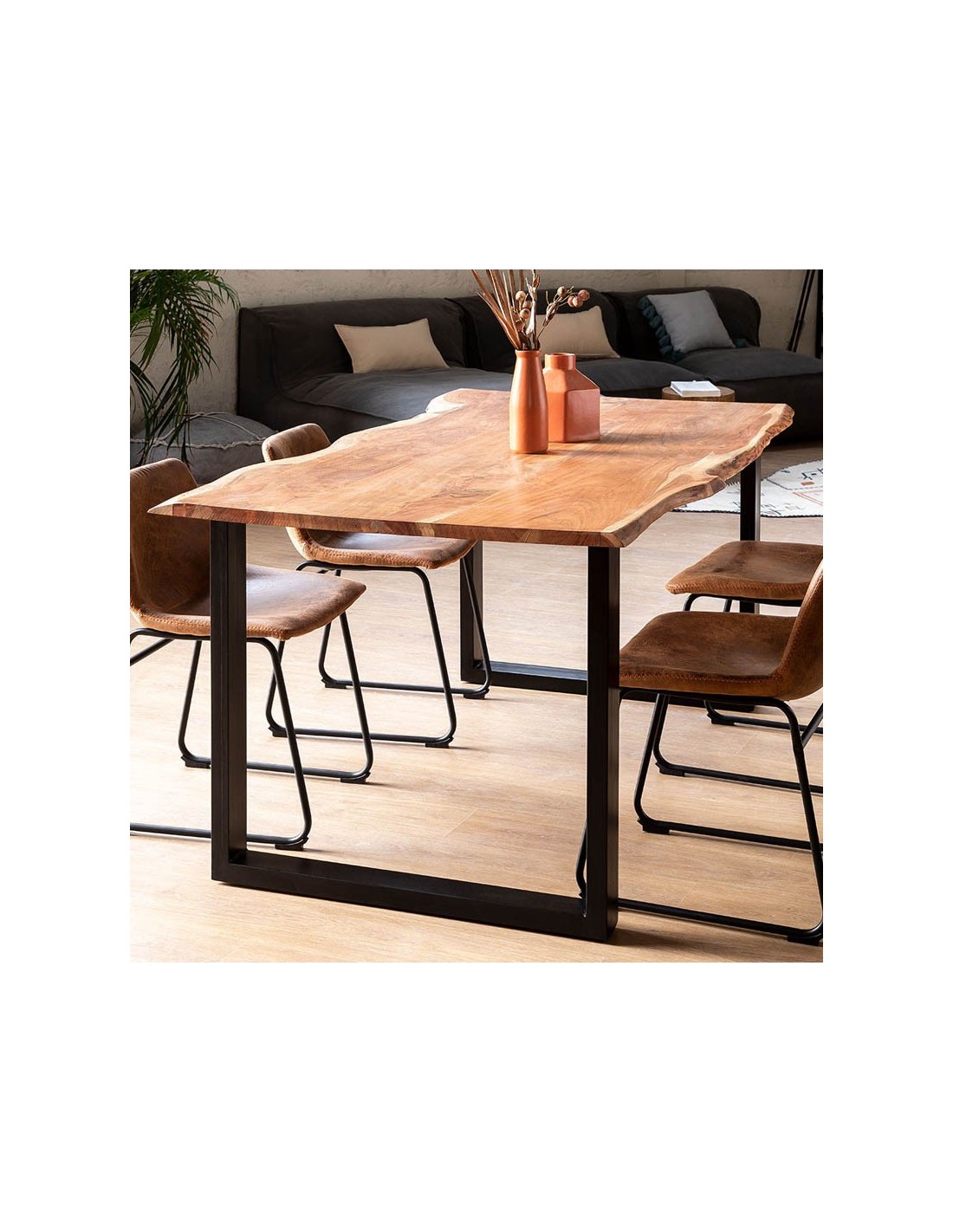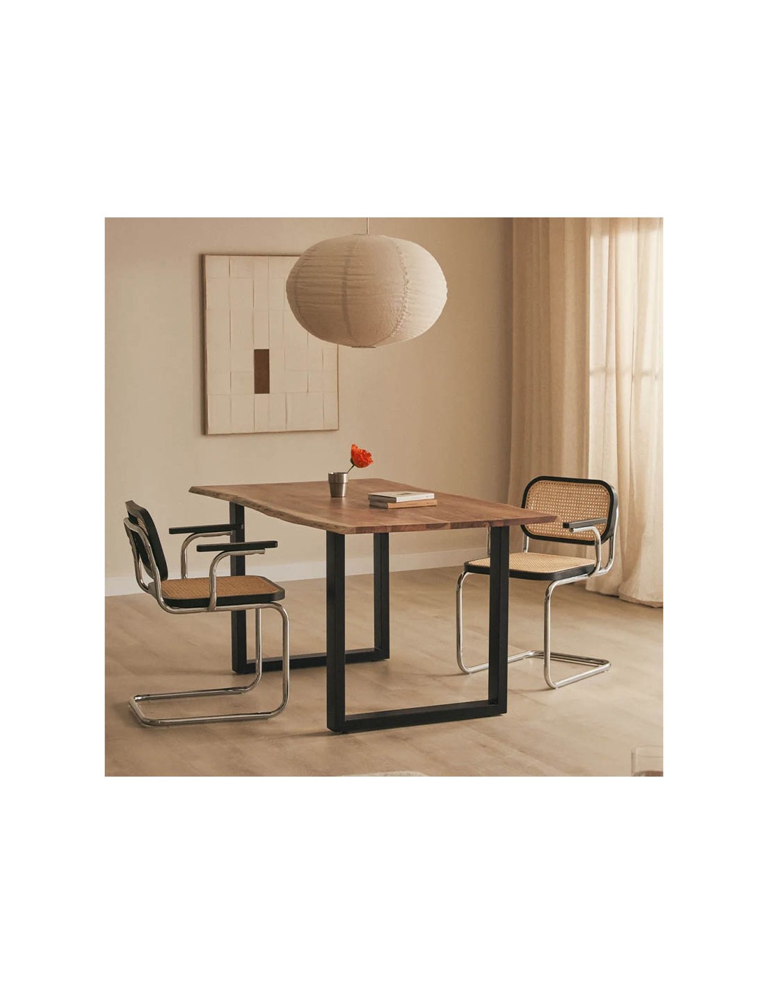 Su robusto tablero de madera reciclada, sin tratamientos químicos ni barnices, se complementa perfectamente con sus patas metálicas de líneas rectas en forma de cubo, creando un contraste atractivo y moderno. Esta mesa es ideal para salones y comedores, proporcionando espacio para hasta seis comensales.
