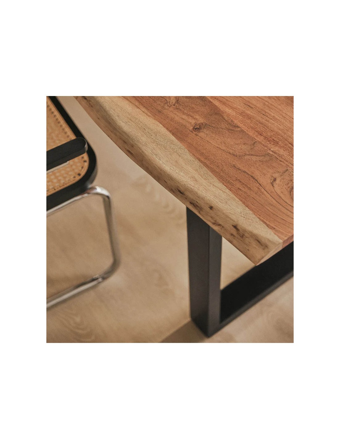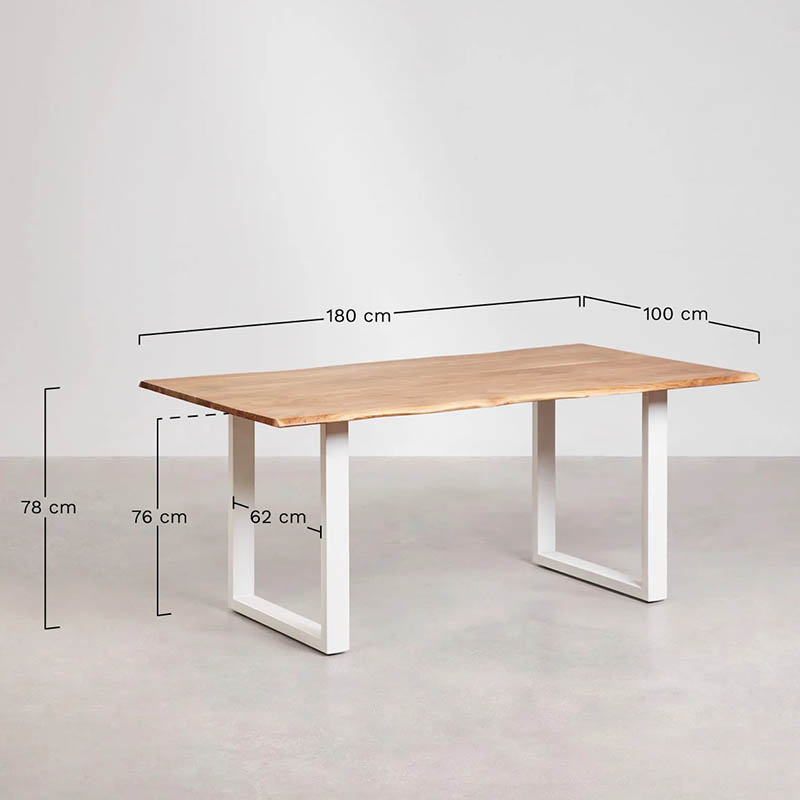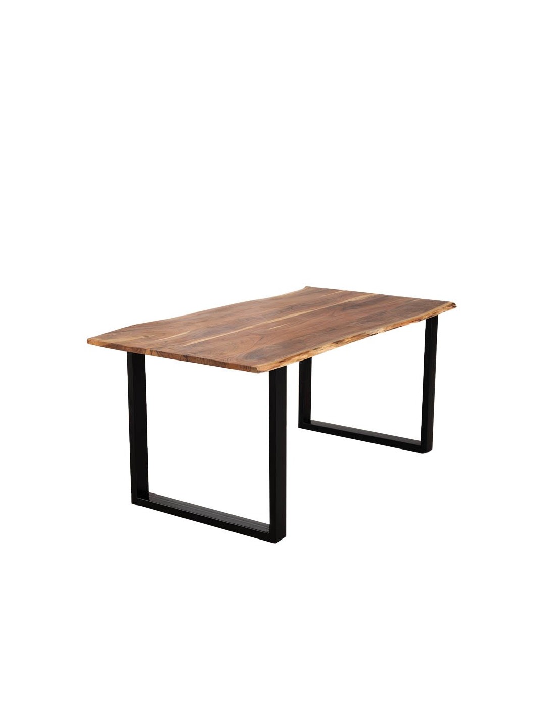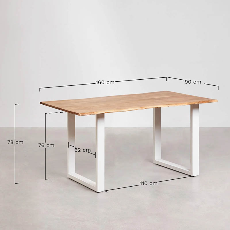 Su robusto tablero de madera reciclada, sin tratamientos químicos ni barnices, se complementa perfectamente con sus patas metálicas de líneas rectas en forma de cubo, creando un contraste atractivo y moderno. Esta mesa es ideal para salones y comedores, proporcionando espacio para hasta seis comensales.