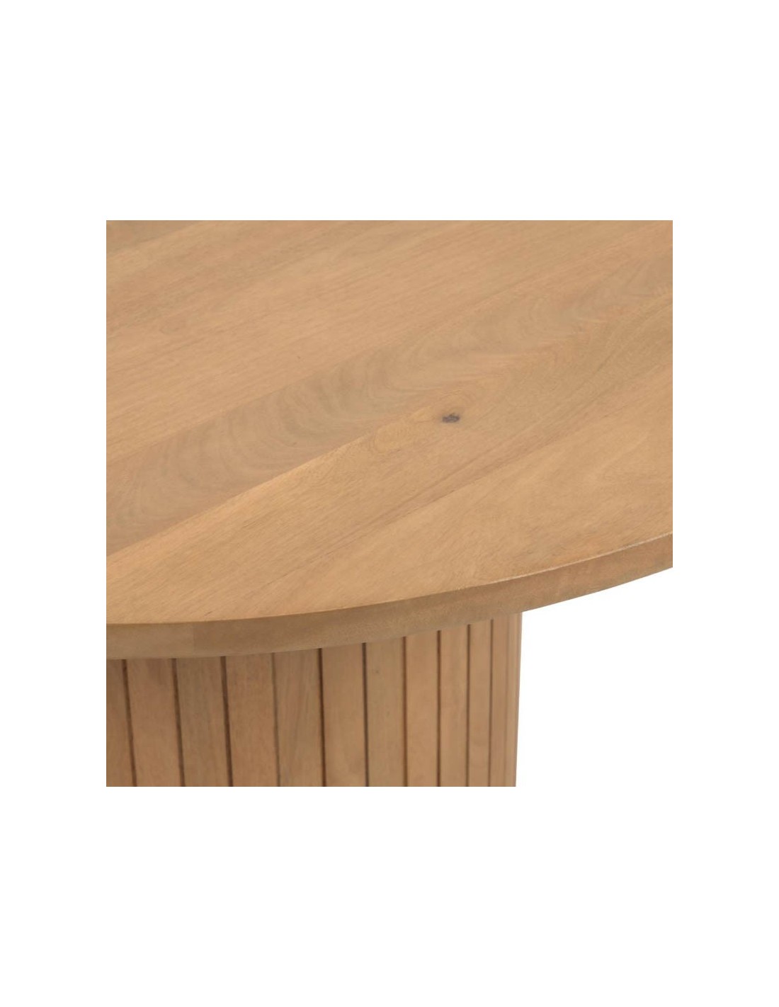 La Mesa Diega R, hecha artesanalmente con madera de mango maciza, aporta fluidez y elegancia a tus interiores. Diseño único y sostenible.