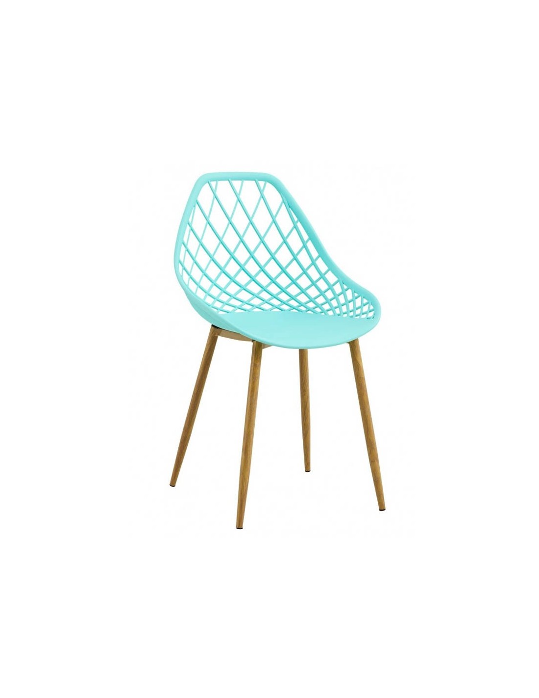 La Silla Emigdia combina una base de metal imitación madera con asiento de polipropileno en colores pastel, ideal para interiores y exteriores protegidos