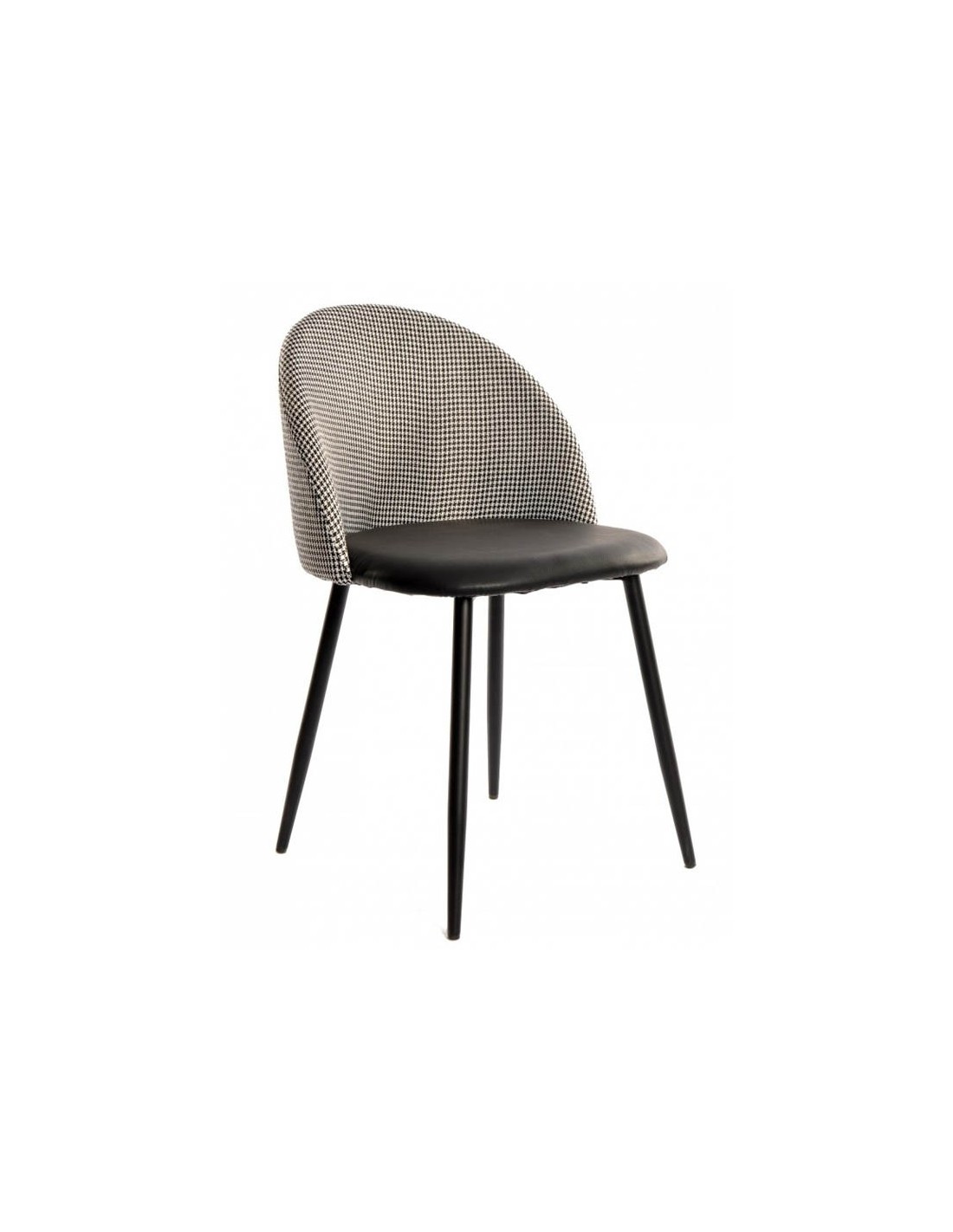 Este silla combina un armazón metálico en epoxi negro con un respaldo en pata de gallo y asiento en similpiel, aportando sofisticación a cualquier espacio