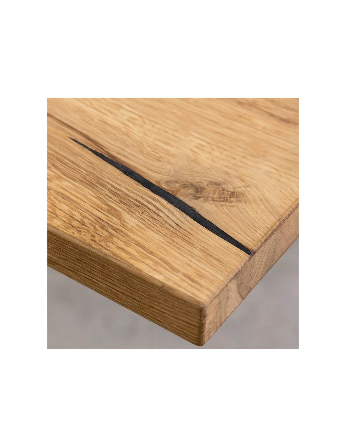 Con un tablero rectangular de 190x100 cm, esta mesa destaca por su elegancia y sofisticación. El tablero está acabado en chapa de roble rústico con un borde de roble macizo, lo que le confiere un aspecto distintivo y de alta calidad.