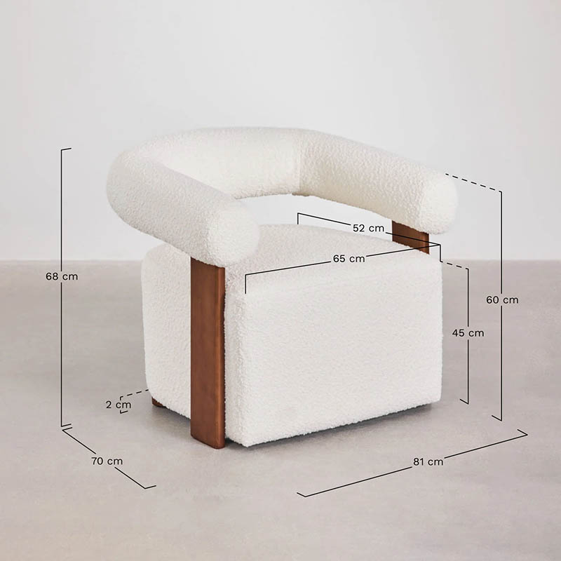 Tapizado en suave tela bouclé (85% poliéster / 15% acrílico), este sillón destaca por su textura envolvente y estética acogedora. Su estructura interior está fabricada en madera contrachapada de álamo, garantizando resistencia y durabilidad, mientras que su relleno de espuma de poliuretano proporciona una experiencia de descanso placentera y ergonómica.