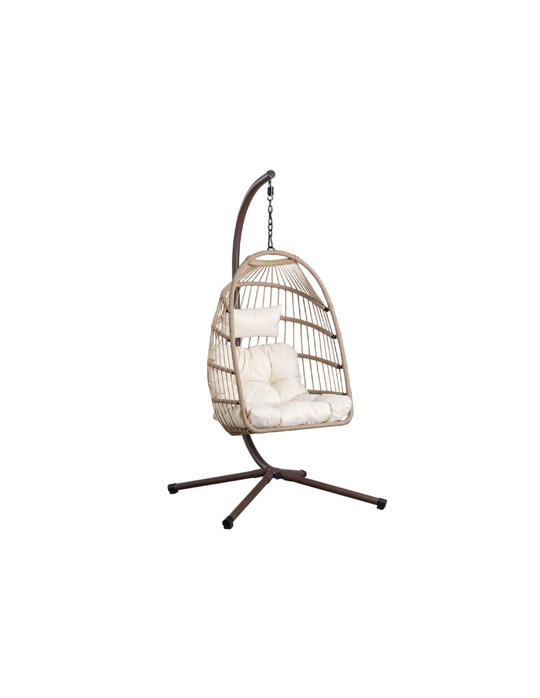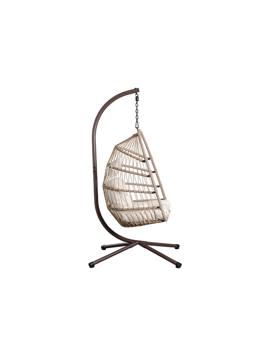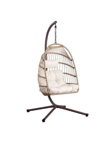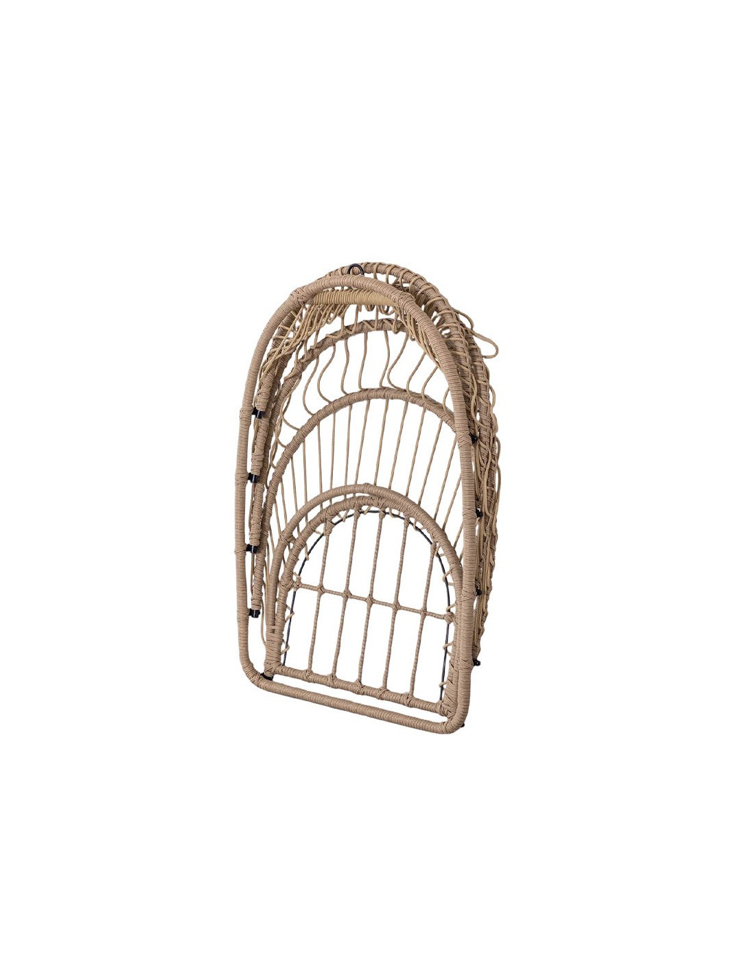 Su estructura tubular de hierro garantiza resistencia y estabilidad, mientras que el asiento está realizado en ratán sintético de acabado artesanal, creando un diseño envolvente que aporta ligereza visual.