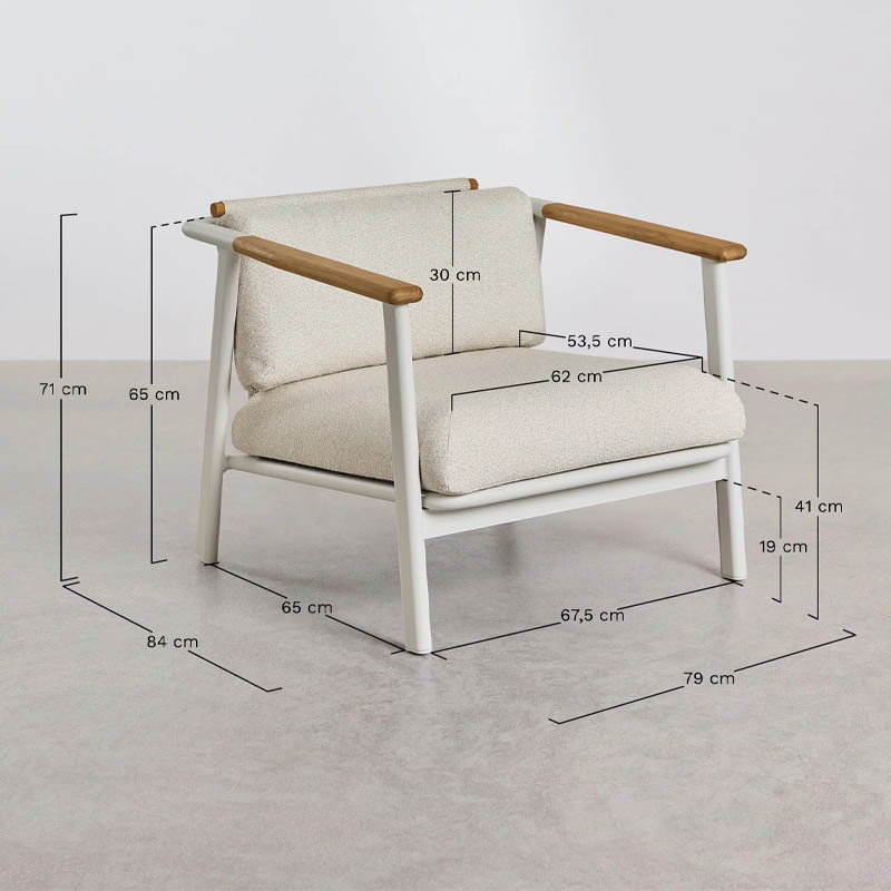 Ambos cojines son desenfundables y están tapizados en poliéster con textura bouclé y tratamiento hidrófugo (repelente al agua), ideal para espacios exteriores.