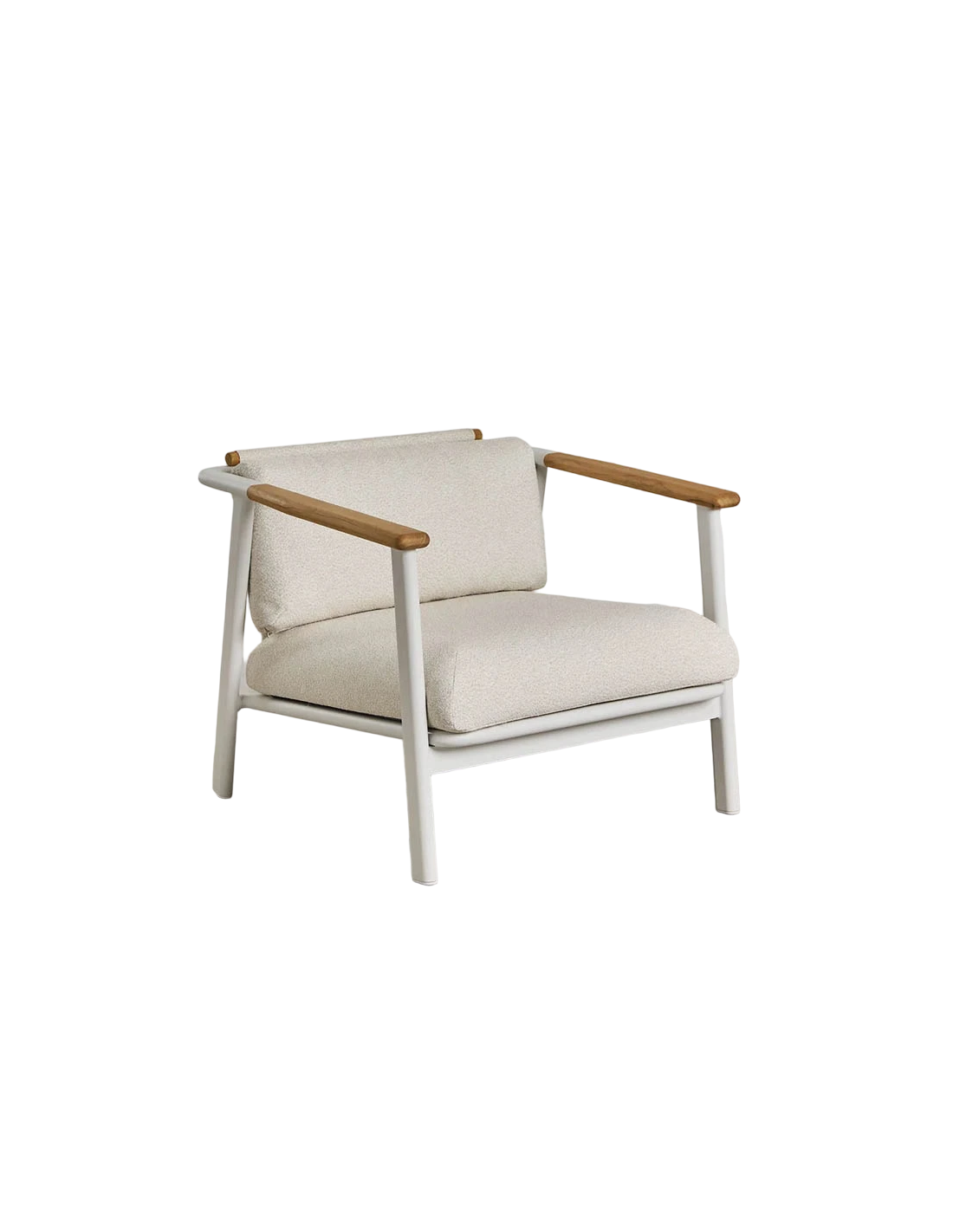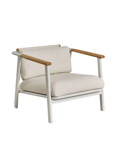 El detalle en madera de teca natural sobre los reposabrazos añade un toque cálido y prémium, además de ser un material sostenible y resistente a los cambios climáticos.