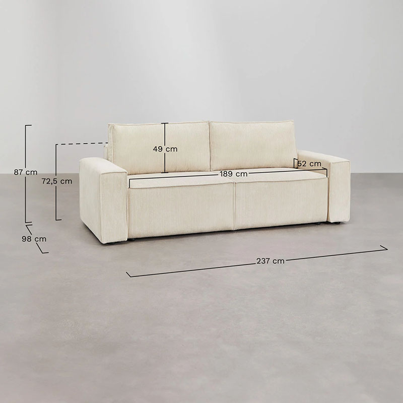 Sofá cama de 3 plazas con sistema de apertura tipo delfín, firmeza suave y muelles ensacados. Tapizado en pana beige crema, cómodo, resistente y perfecto para uso interior.