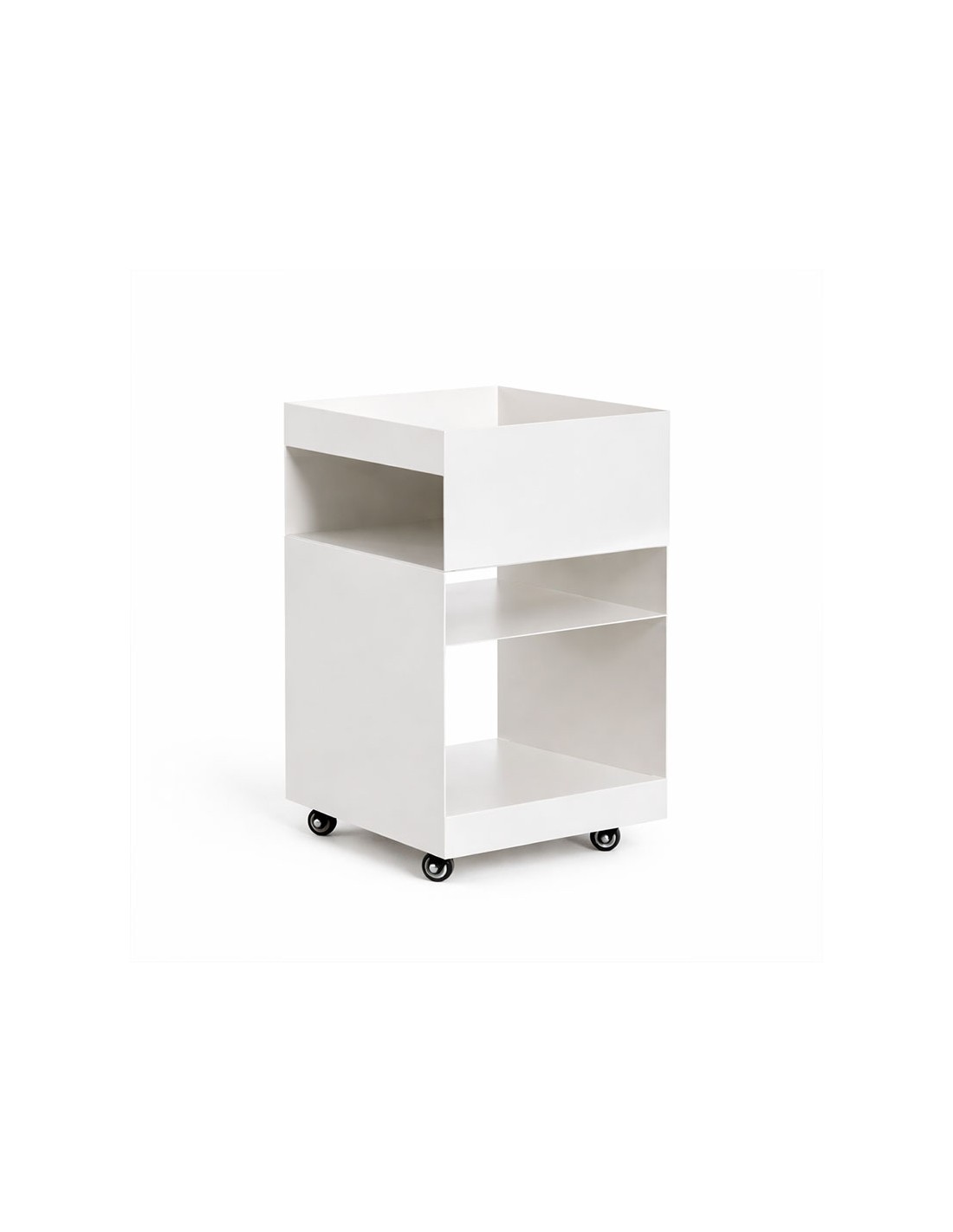 Mesa auxiliar cuadrada 35x35 cm fabricada en acero con acabado mate y pintura en polvo. Con ruedas y estantes para un almacenamiento práctico en interior.