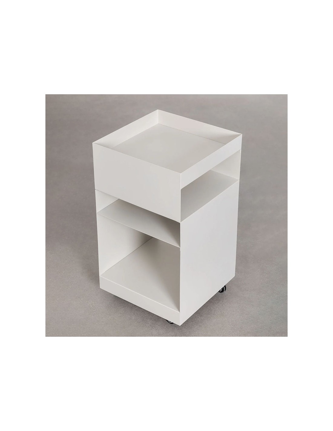 Mesa auxiliar cuadrada con ruedas en acero. Movimiento y orden en un solo diseño.