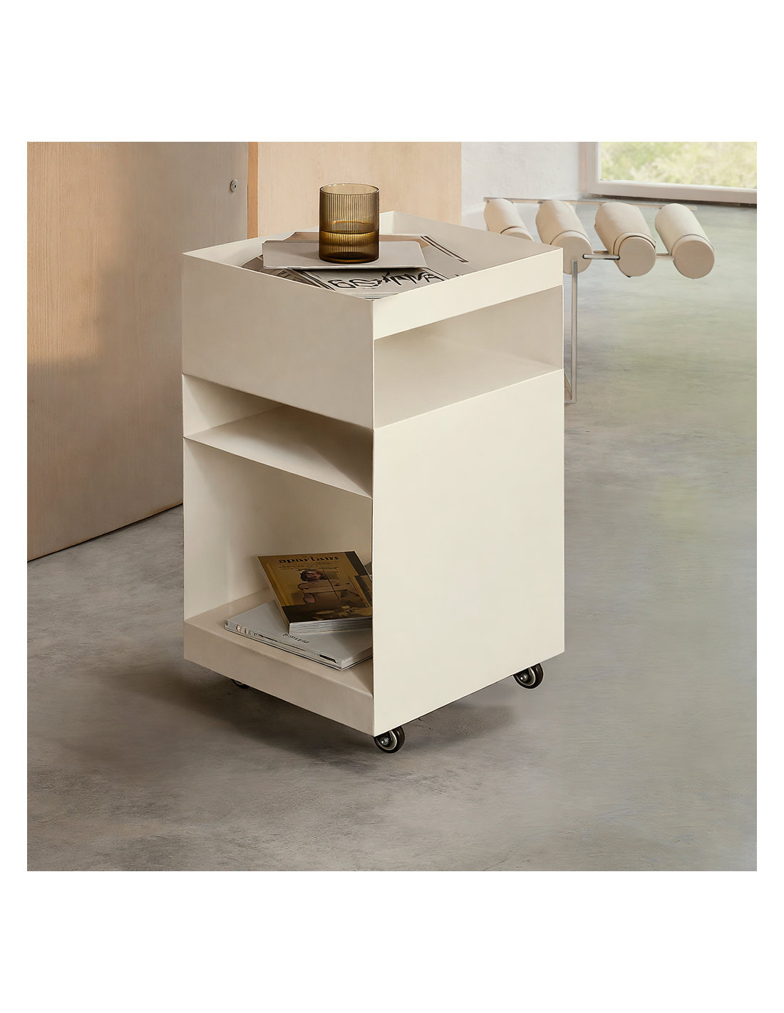 Fabricada en acero con acabado mate y tratamiento de pintura en polvo, garantiza resistencia y durabilidad en el uso diario. Incorpora ruedas integradas que facilitan su desplazamiento sin esfuerzo, permitiendo reorganizar el espacio con total comodidad. Además, sus estantes abiertos proporcionan un práctico espacio de almacenamiento adicional, perfecto para libros, accesorios o elementos decorativos.