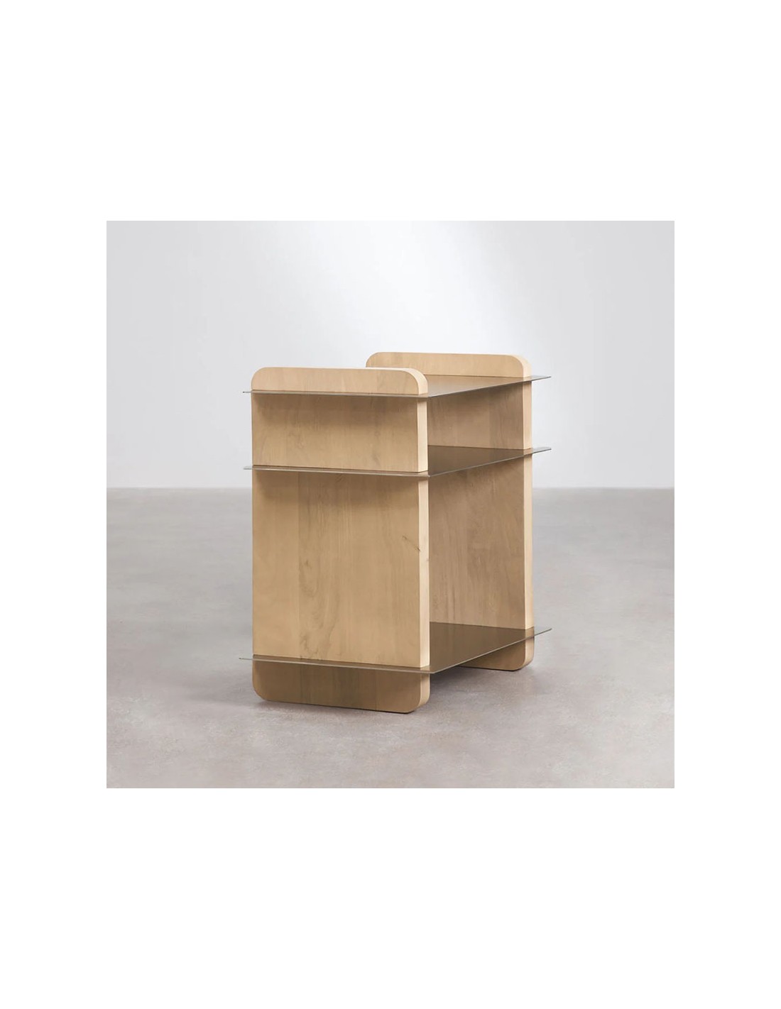La estructura y las patas están elaboradas en madera de mango con acabado lacado mate, aportando un tono acogedor y doméstico. El contraste lo ponen sus tres estantes de acero cromado cepillado, de grosor fino y aspecto ligero, perfectos para mantener a mano libros, revistas u objetos decorativos sin perder orden. Además, incluye tacos de plástico protectores y ajustables en la base, para proteger el suelo, mejorar la estabilidad y adaptarse con facilidad a distintas superficies.