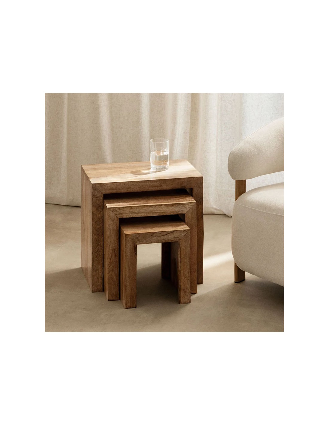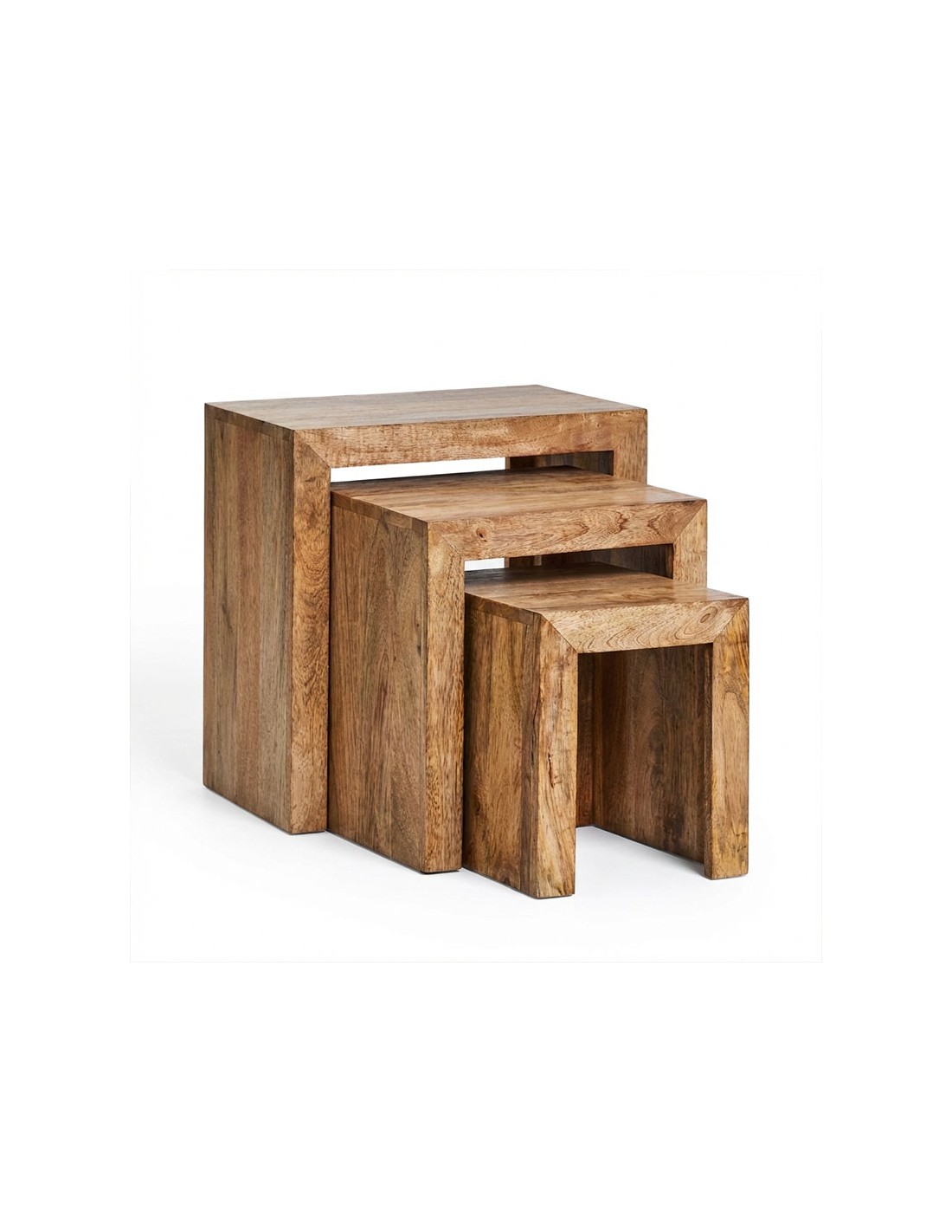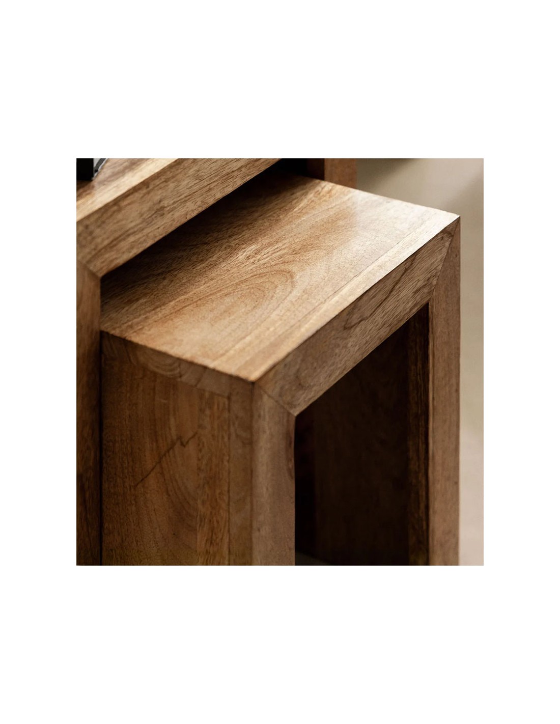 Set de mesas auxiliares nido rectangulares en madera maciza de mango con acabado mate barnizado. Diseño minimalista y modular para interior, perfecto para ahorrar espacio y ganar versatilidad.