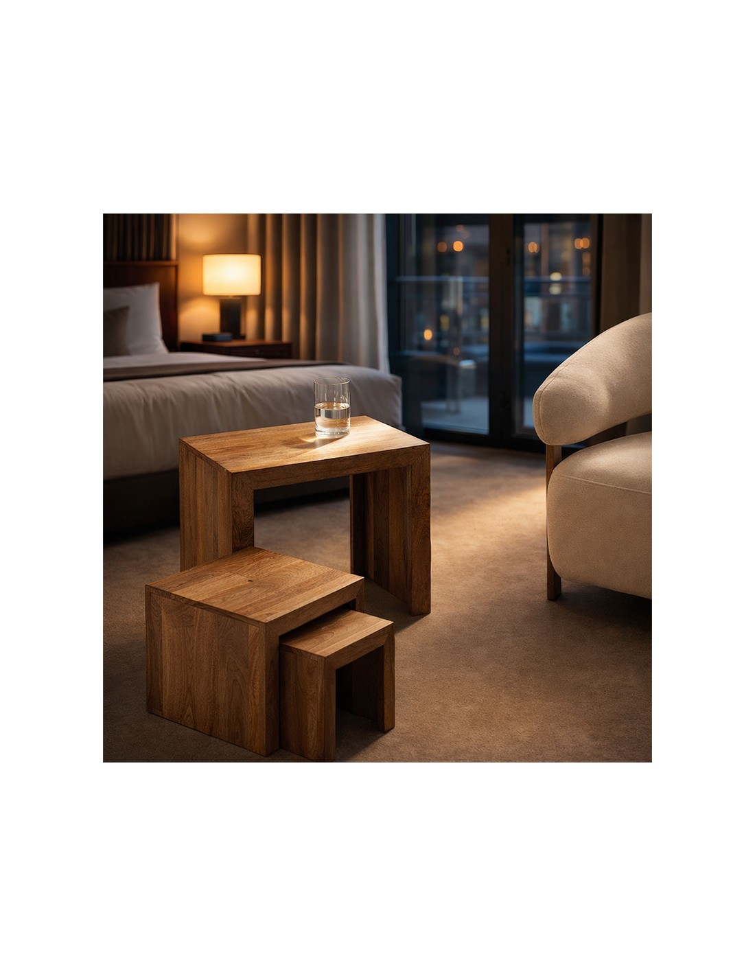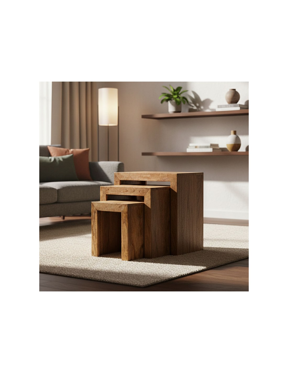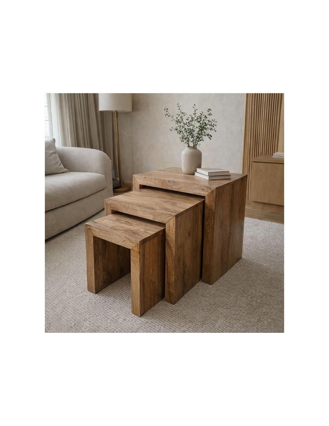Set de mesas auxiliares nido rectangulares en madera maciza de mango con acabado mate barnizado. Diseño minimalista y modular para interior, perfecto para ahorrar espacio y ganar versatilidad.