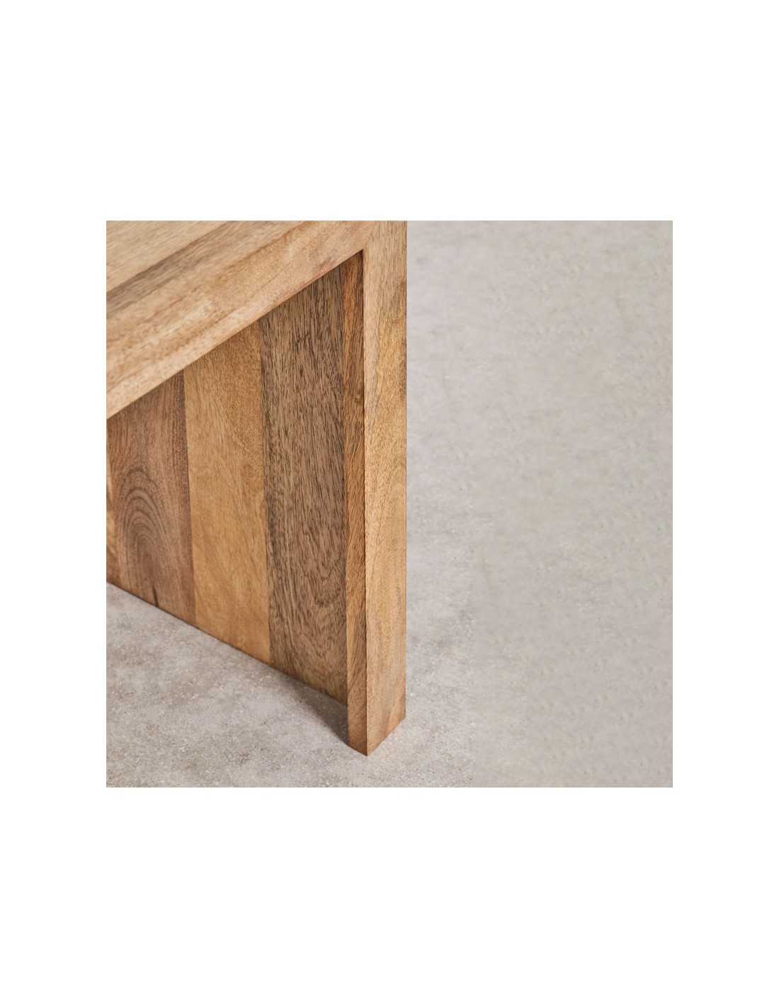 Fabricadas íntegramente en madera maciza de mango con efecto mate y acabado barnizado, muestran un aspecto cálido y auténtico donde las vetas se convierten en parte del diseño. Su estética se apoya en líneas rectas y volúmenes limpios: al no contar con patas diferenciadas, los laterales en bloque actúan como soporte arquitectónico, reforzando su carácter minimalista. Úsalas juntas como conjunto protagonista o separadas para acompañar distintos puntos del salón, dormitorio o zona de lectura.