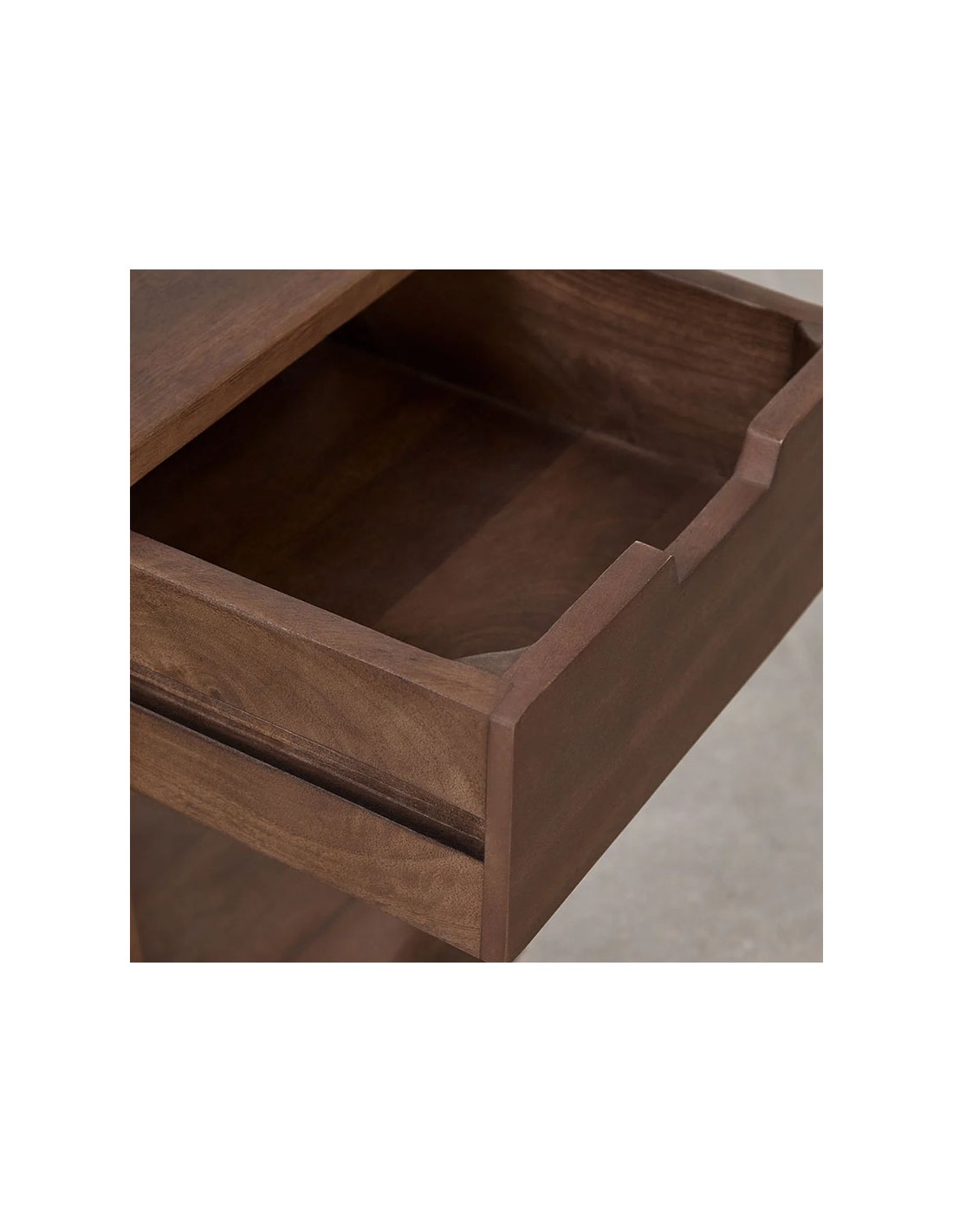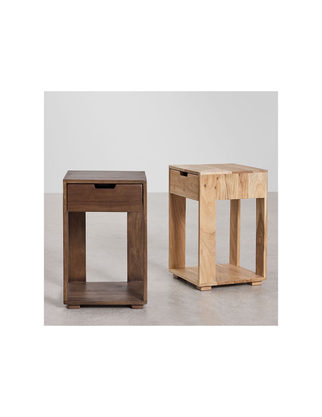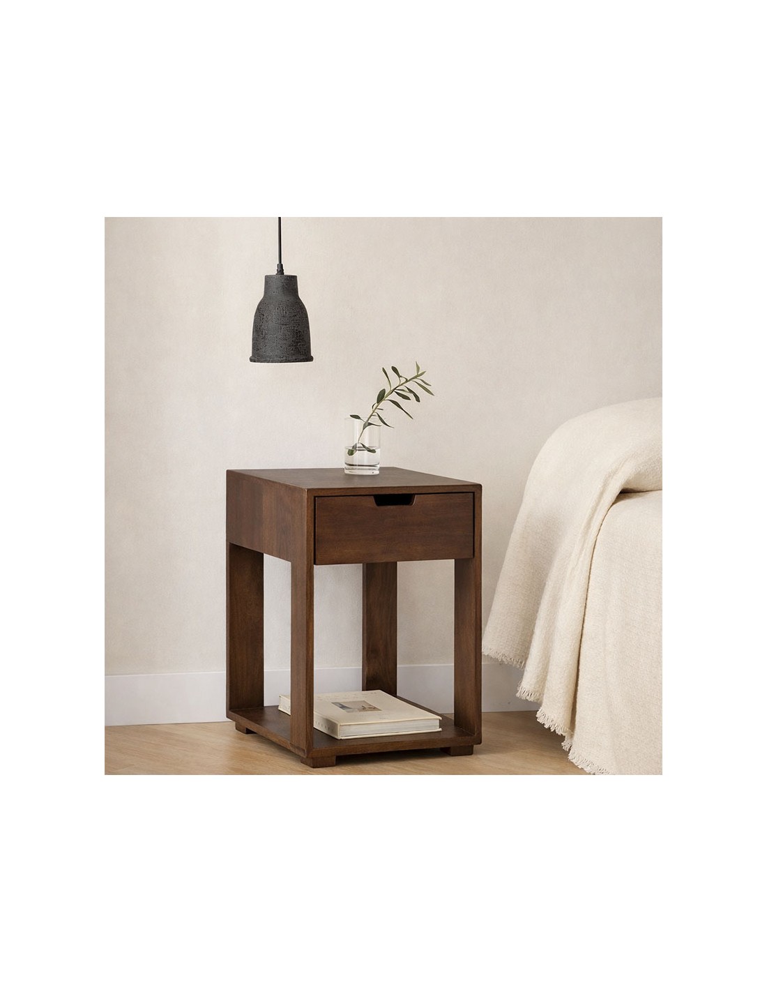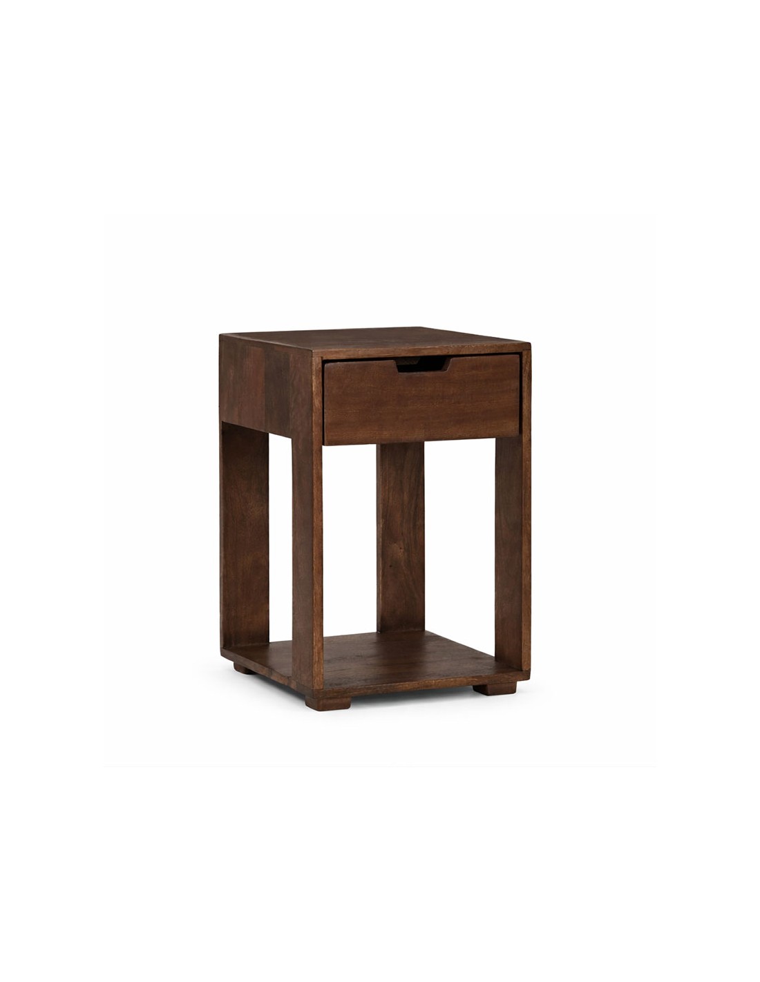 Mesita de noche cuadrada en madera de mango oscura con cajón superior y hueco inferior abierto. Diseño compacto, funcional y cálido para dormitorios de estilo natural y contemporáneo.