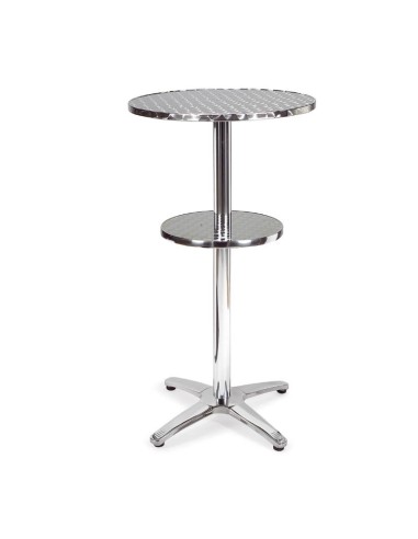 Mesa alta de doble tablero en acero inoxidable repulsado, ideal para exteriores. Elegancia y funcionalidad en un diseño moderno.