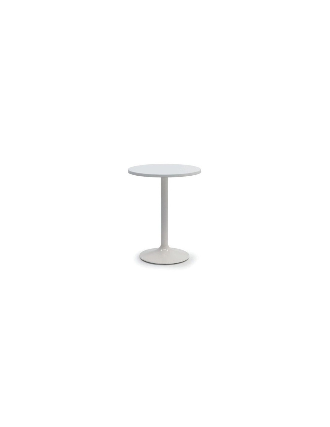 Descubre la Mesa CLOVI con encimera de melamina de 25 mm, perfecta para interiores. Disponible en varios colores y alturas.